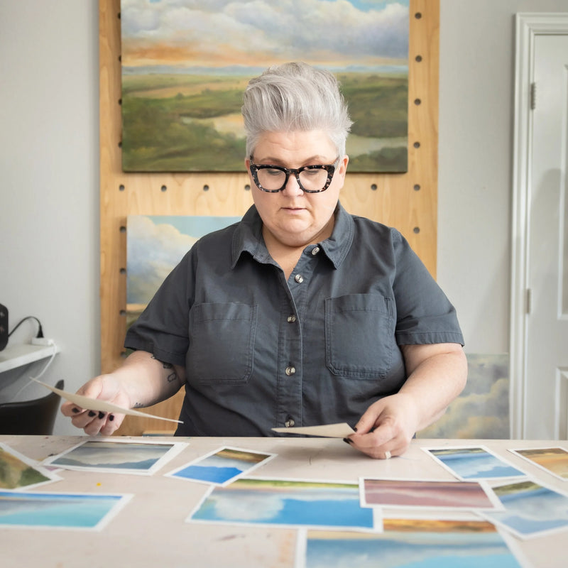 When I pick up a paint brush, I feel an instant connection to what is happening on the canvas. I rarely work off a reference photo – choosing to work either freestyle or from small studies I have created from places that come from inside me. I let the piece lead the story along until I find a place of satisfaction in the work. My current subject matter is large cloudscapes and landscapes. Clouds are so unpredictable and embody so much power and emotion.