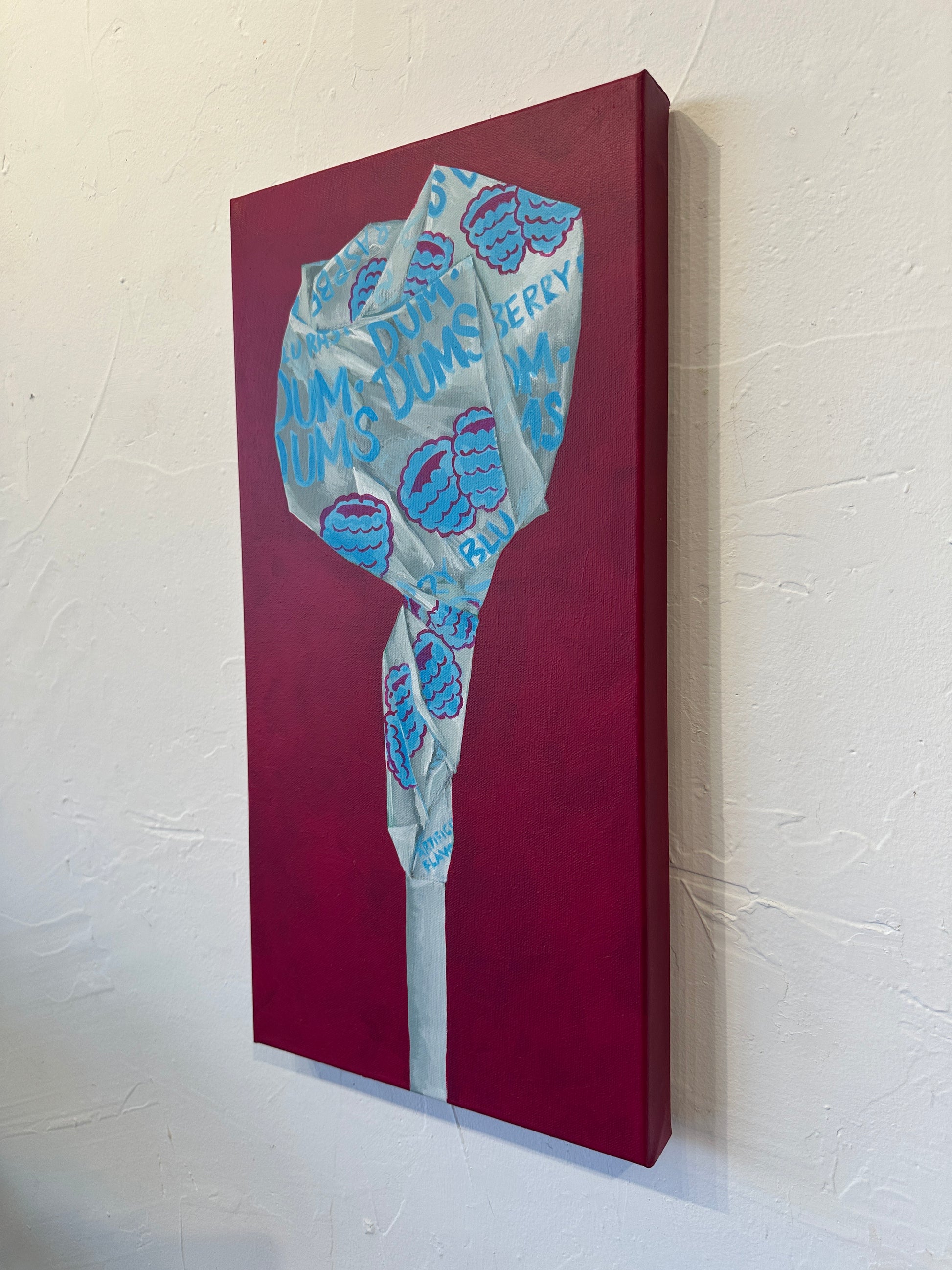 Blue Raspberry Dum Dum is a striking 10"x20" acrylic painting by artist Lindsay Jow that captures the vibrant essence of a classic candy. This contemporary artwork features bold, saturated blues and crisp details that bring the iconic sucker to life on canvas. Perfect for collectors who appreciate pop culture-inspired fine art or anyone seeking a statement piece with nostalgic charm and modern artistic execution. A distinctive addition to any gallery wall or creative space.