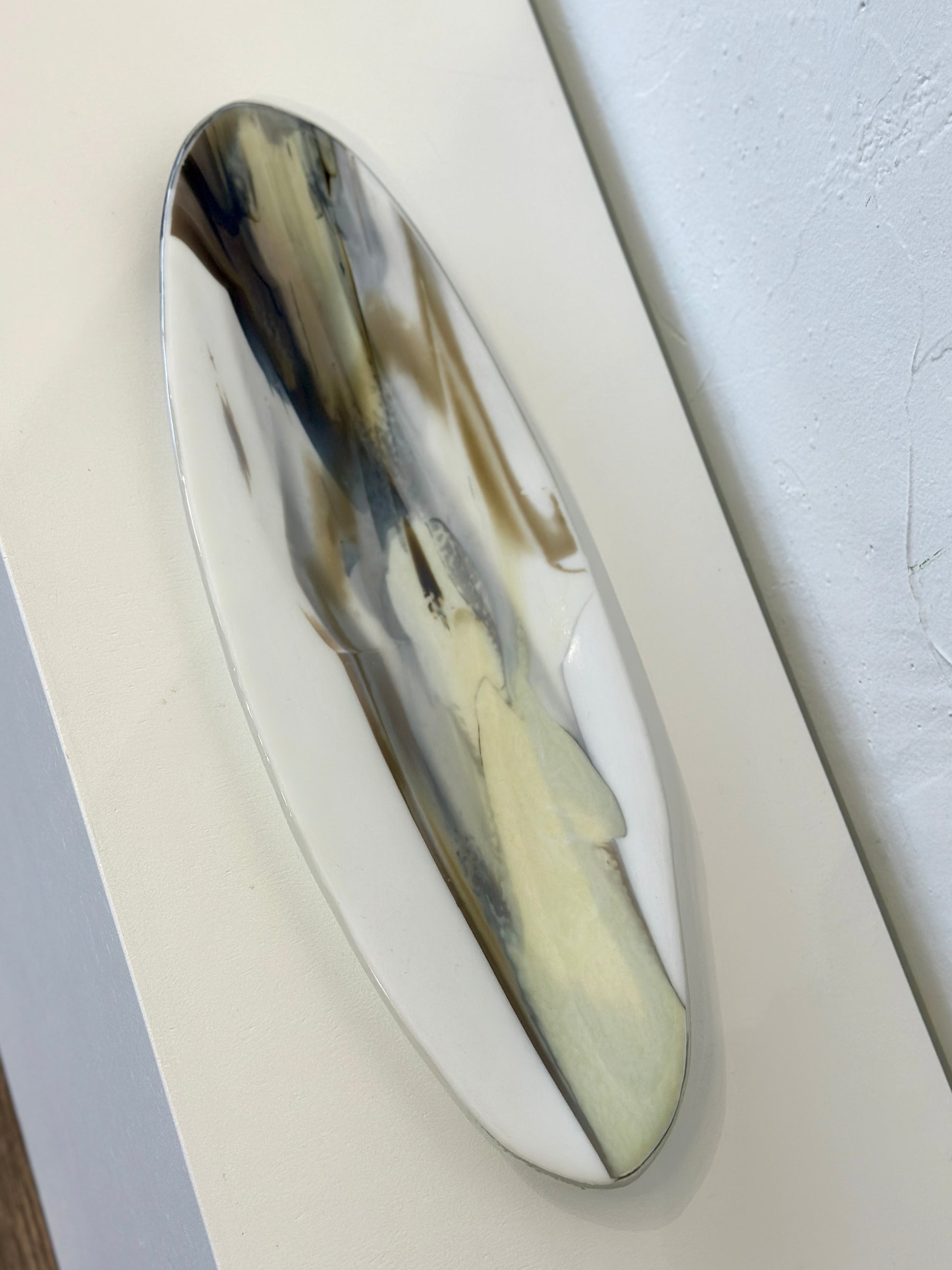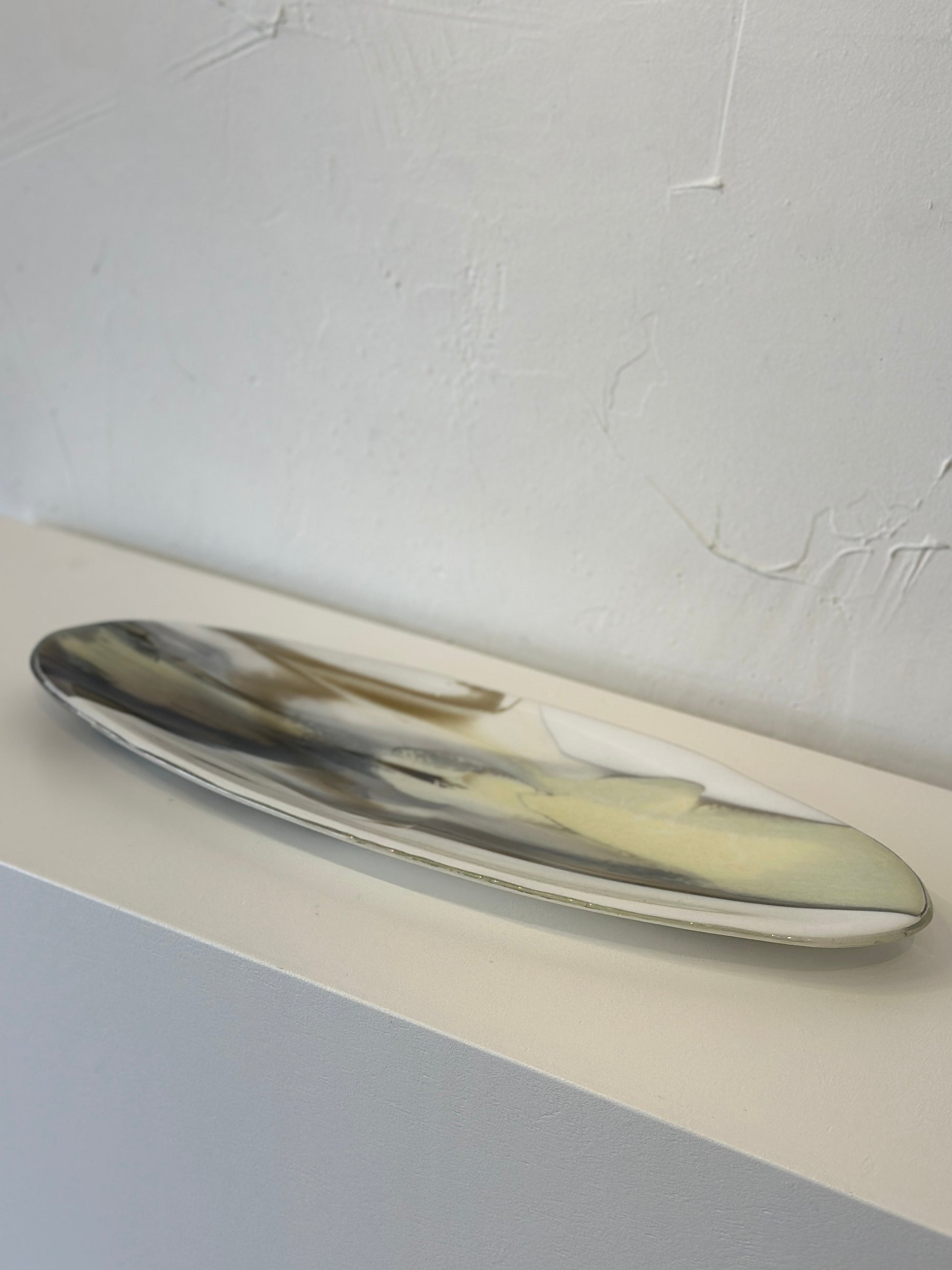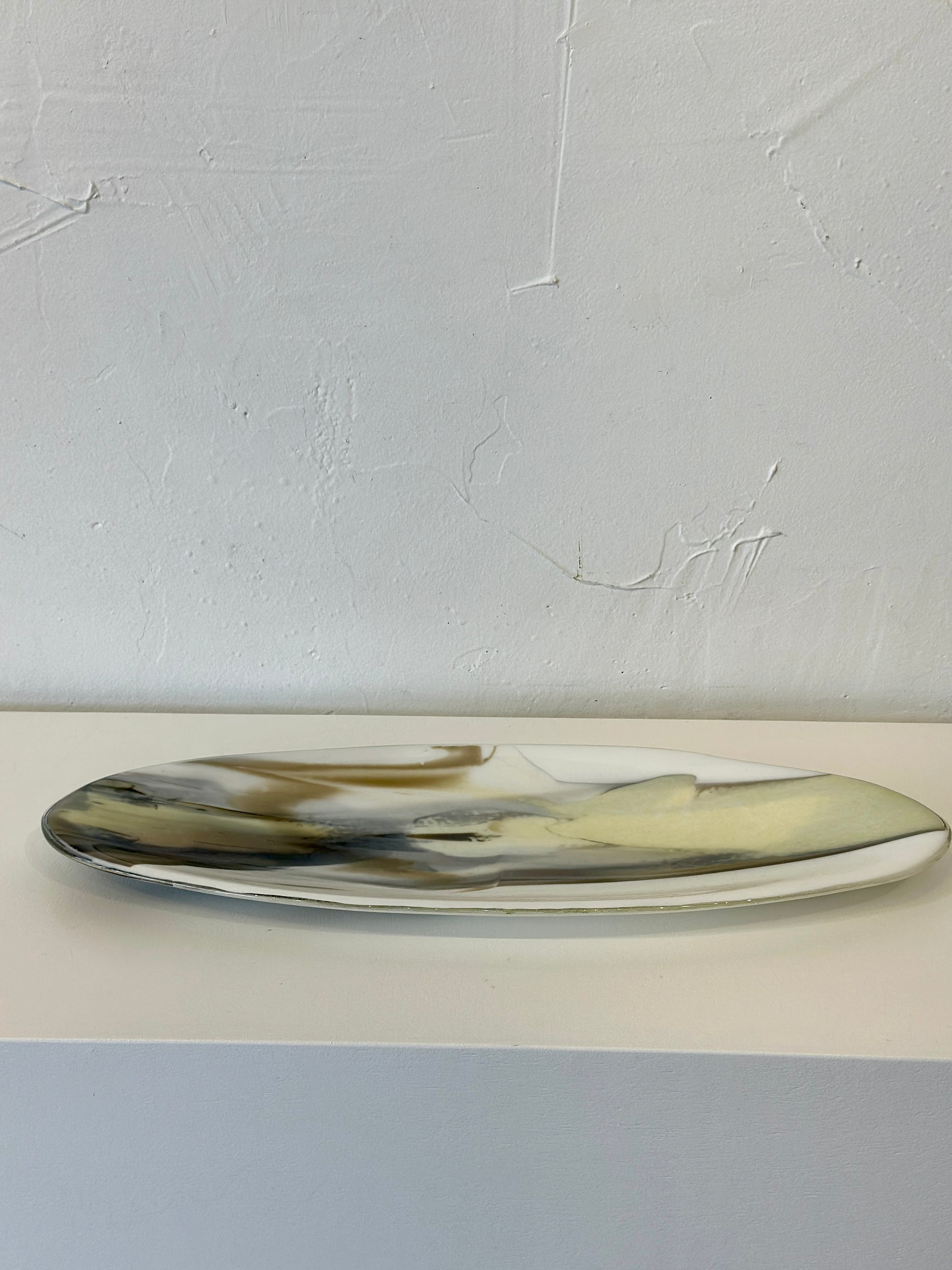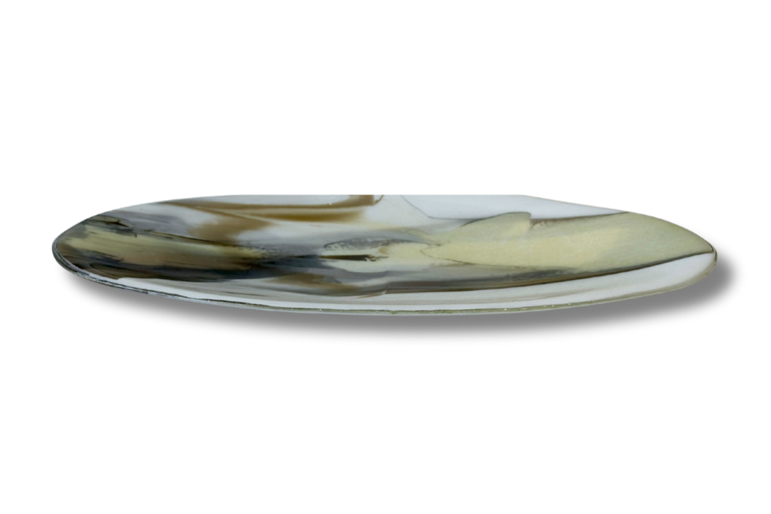 This exquisite round fused glass tray showcases the masterful artistry of Kashmira Mistry. Each piece is meticulously handcrafted using traditional fused glass techniques, resulting in a one-of-a-kind functional art object. The neutral color palette ensures versatile styling across any interior aesthetic, while the smooth, polished surface reflects light beautifully. Perfect for displaying jewelry, serving appetizers, or as a standalone sculptural accent, this tray demonstrates the artist's sophisticated understanding of glass composition and form. A distinctive addition to any discerning collector's home.