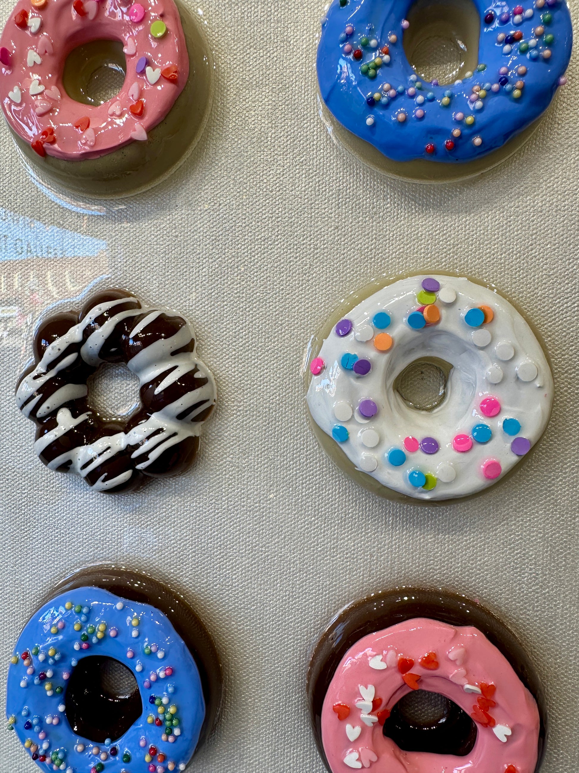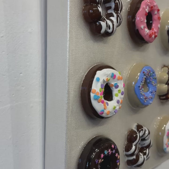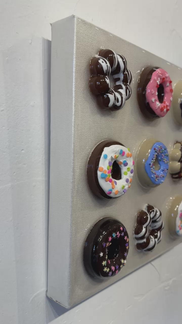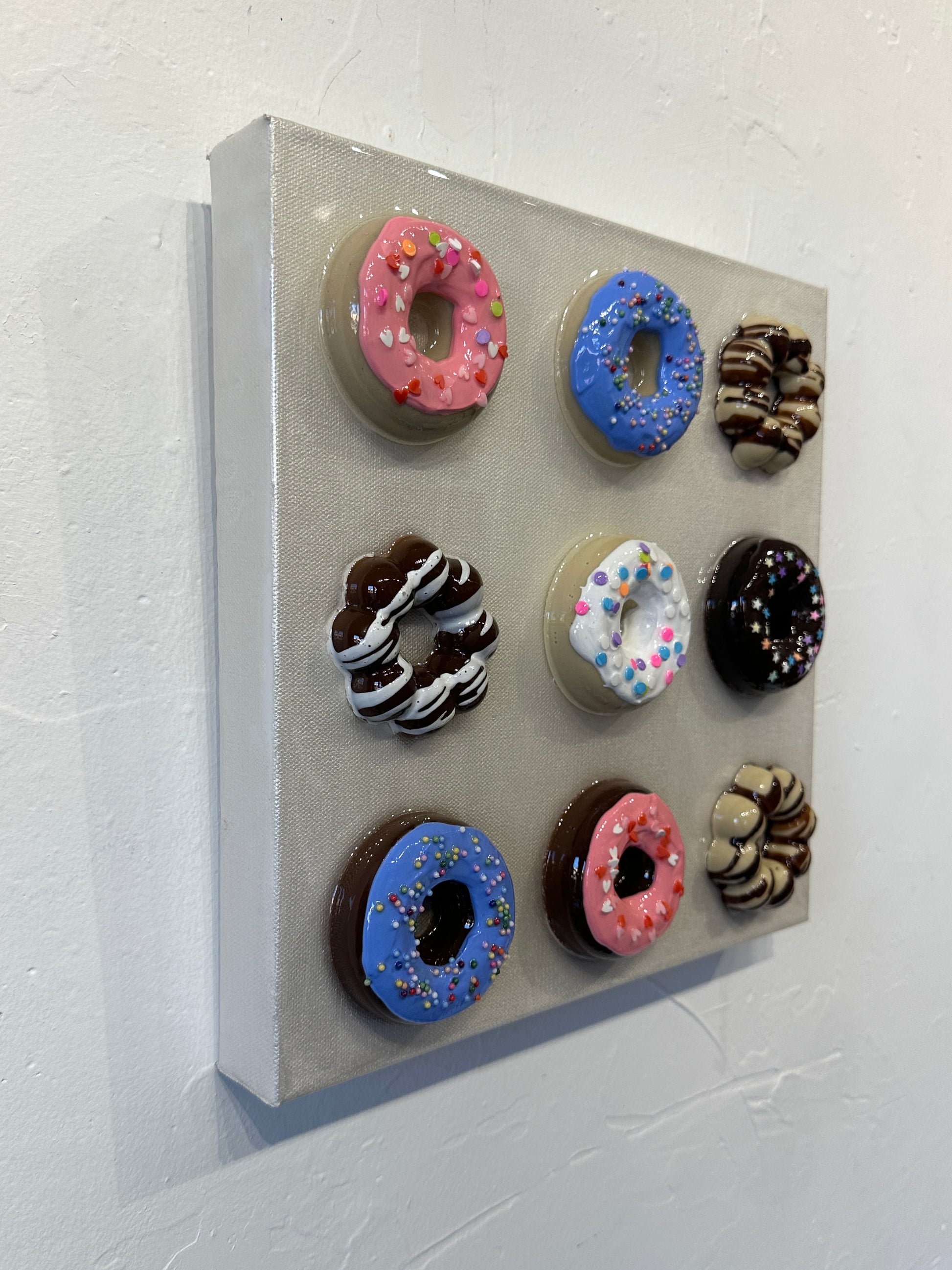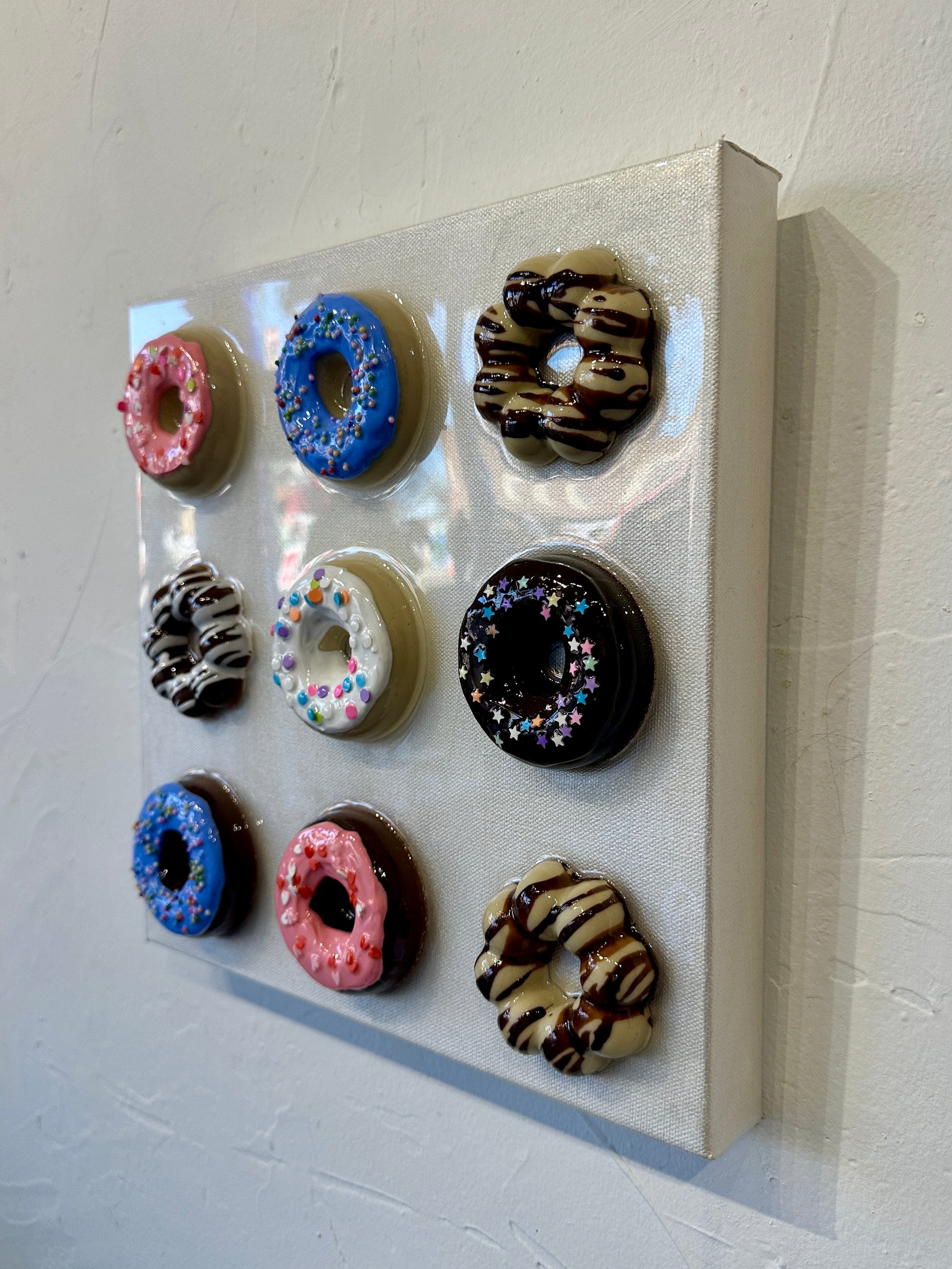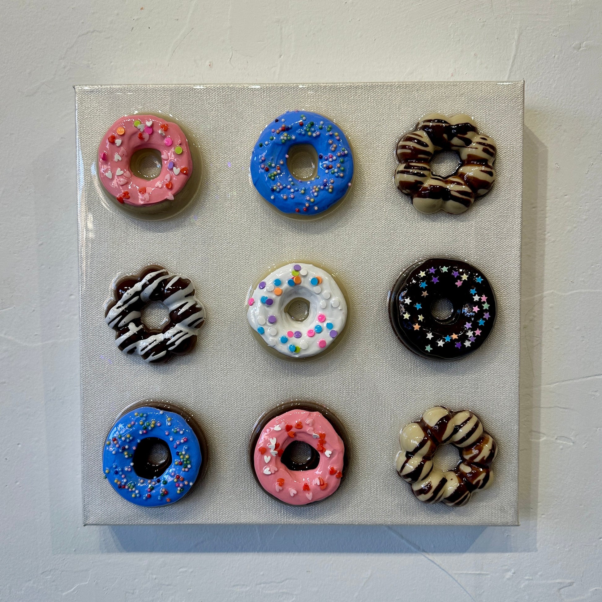 A striking 12"x12" mixed media composition by Hunter Connor featuring nine meticulously rendered donuts. This piece combines traditional artistic techniques with contemporary resin elements, creating dimensional depth and visual intrigue. The work demonstrates sophisticated color theory and compositional balance, making it an engaging addition to any collection. A thoughtful exploration of everyday subjects elevated through skilled craftsmanship and material innovation.