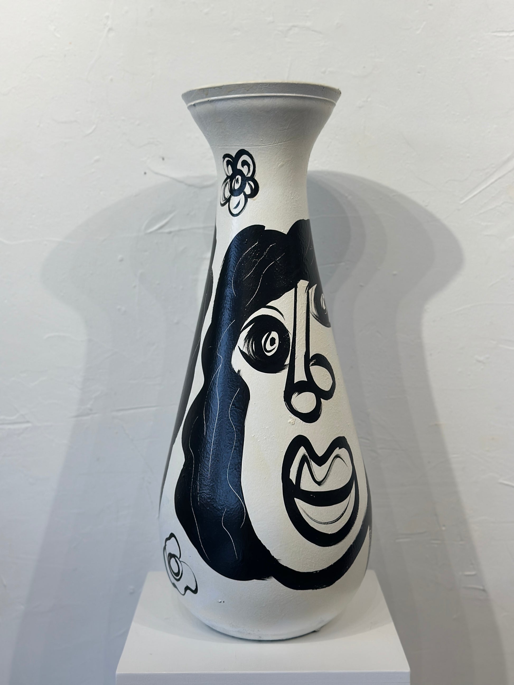 This striking ceramic vase showcases Peter Keil's distinctive expressionist style, rendered in bold black and white oil on glazed ceramic. Standing 24 inches tall with a 10-inch diameter, the piece features dynamic portraiture that captures raw emotion through gestural brushwork and high contrast. A sophisticated functional art object that commands attention as both vessel and gallery-quality statement piece. Ideal for collectors seeking contemporary ceramic art with painterly depth and psychological presence.
