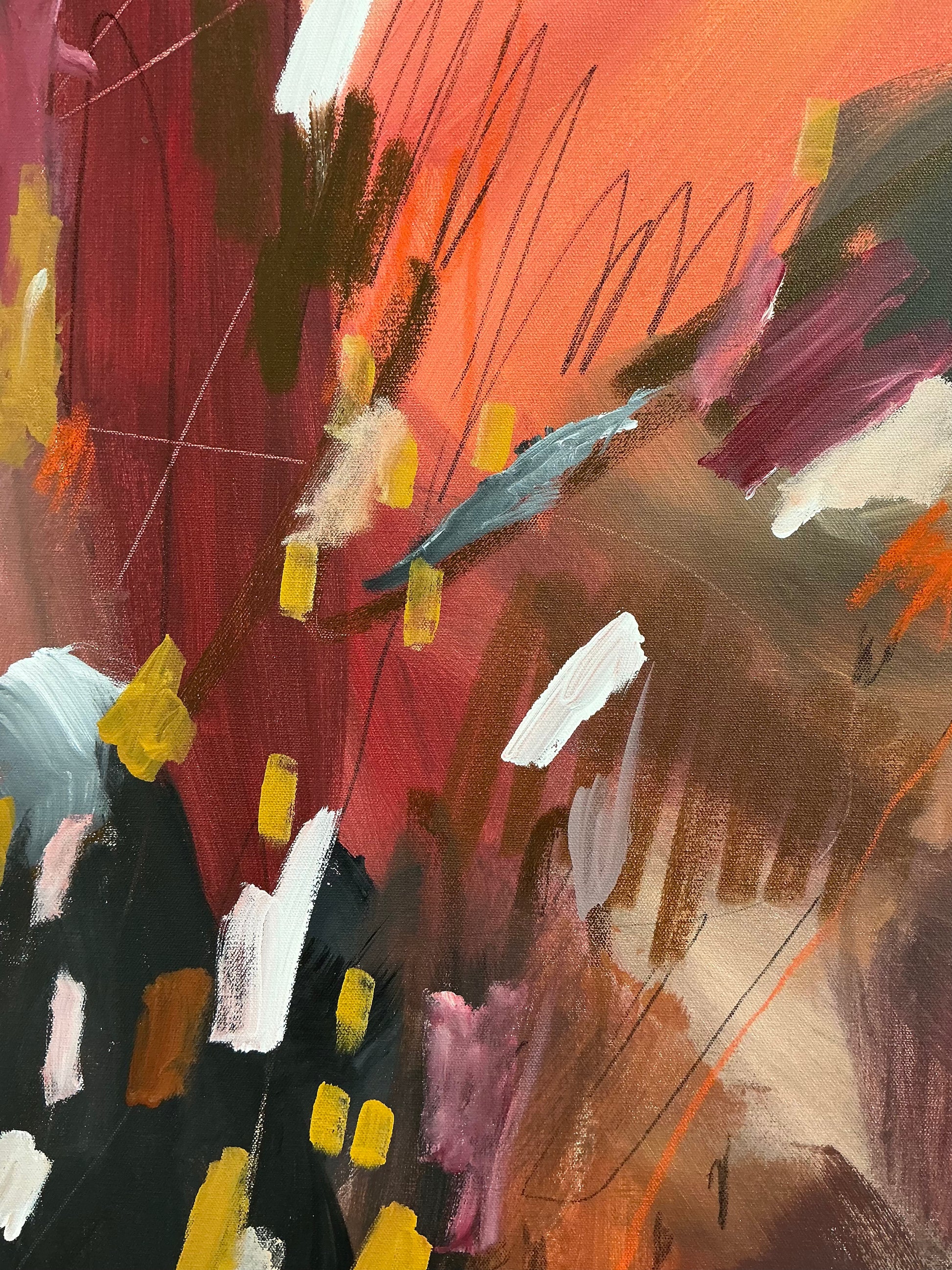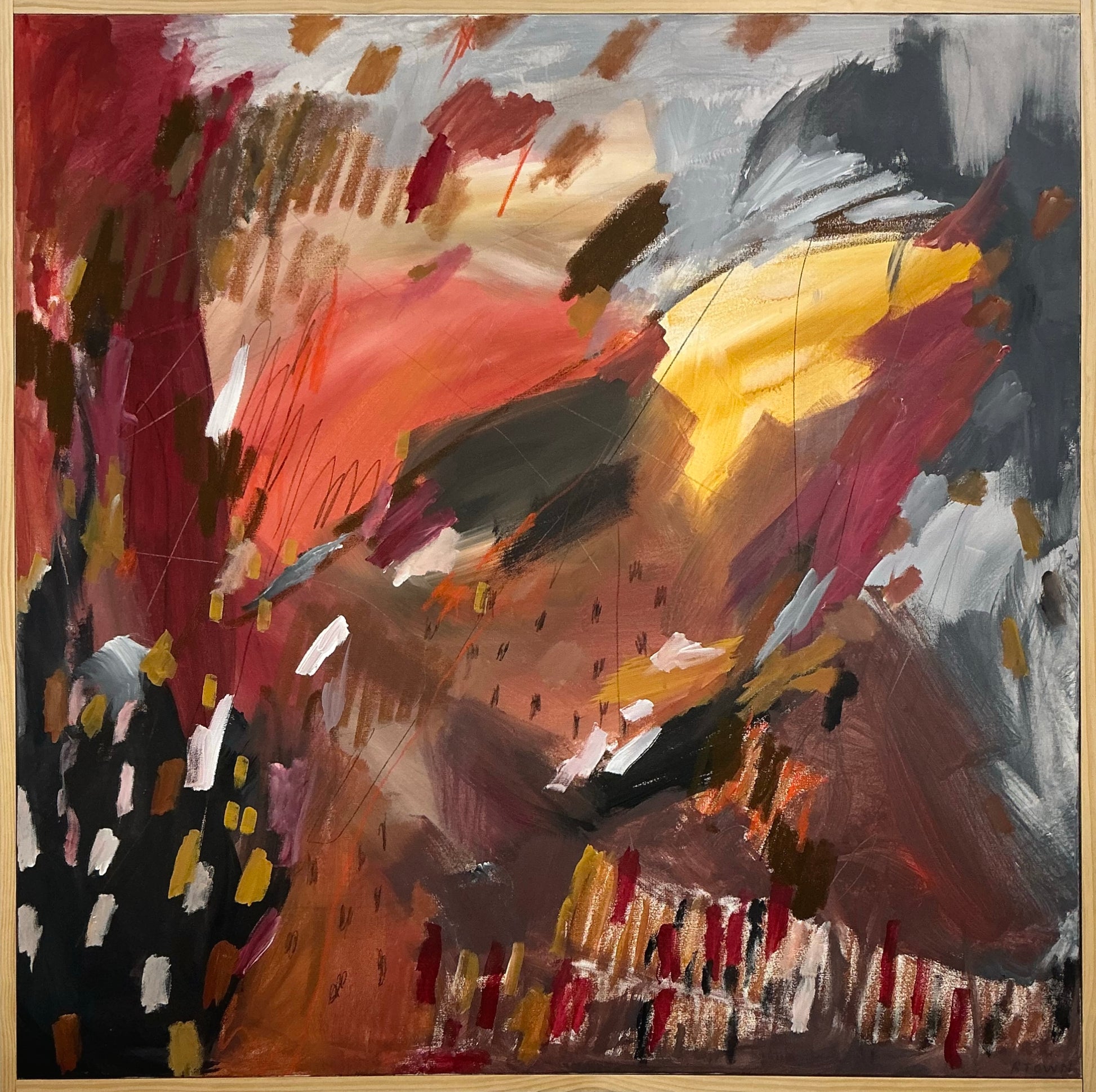Cinnamon is a moody mixed media composition by Rachel Townsend, measuring 50”x50” on canvas. This layered piece showcases Townsend’s material expertise and technical control, projecting a visually complex narrative in rich shades and textures. Framed in natural wood, the sizable scale of her work is perfect for enhancing the atmosphere of collaborative environments and private collections alike.