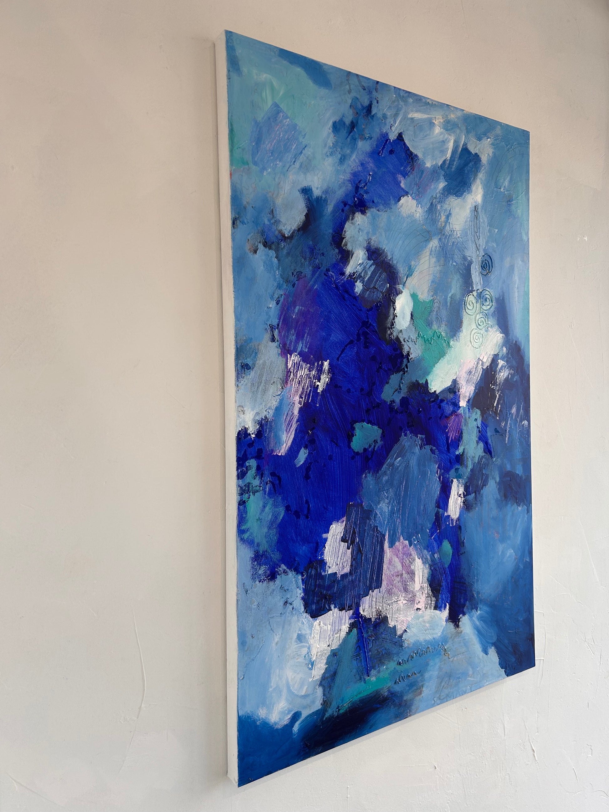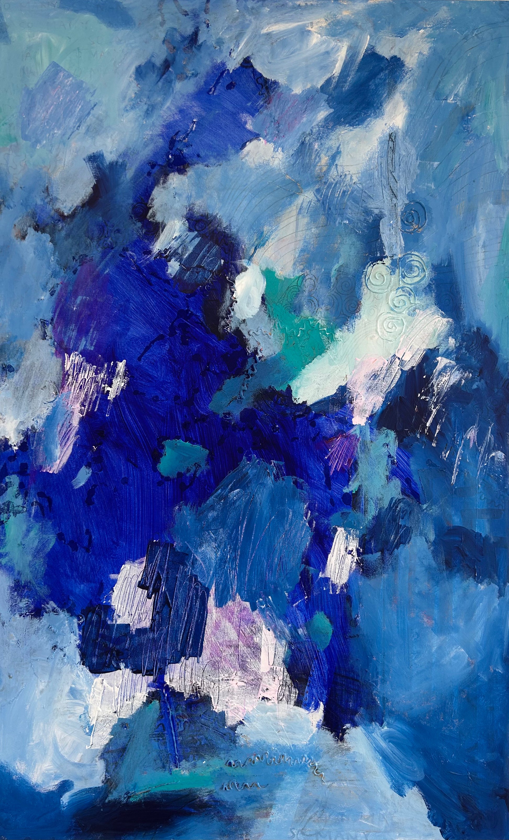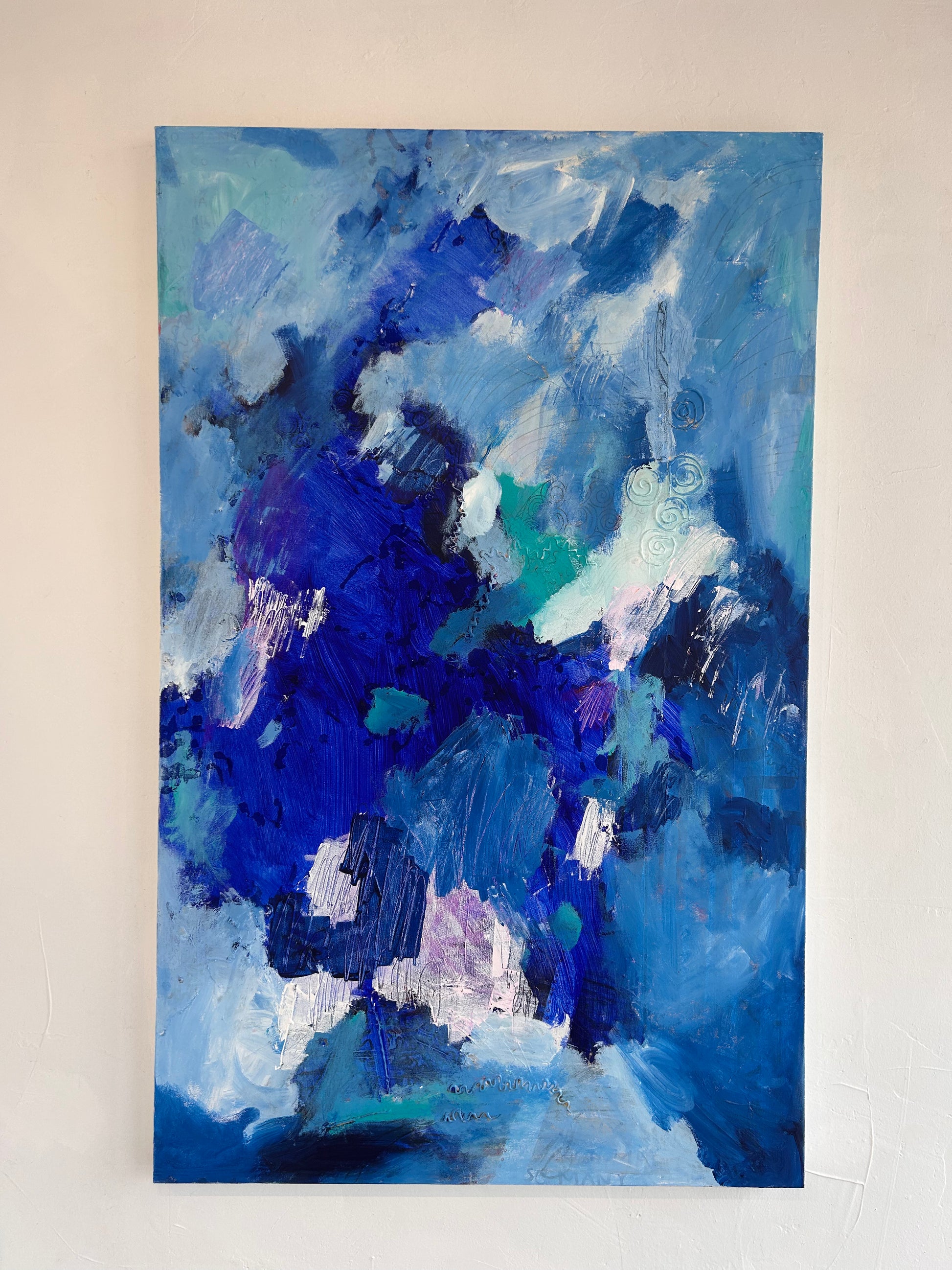 Contemplative Bliss is a 48"x30" mixed media composition by Rachel Townsend that merges diverse materials and techniques to create visual depth and complexity. This substantial work invites prolonged viewing, revealing layered textures and nuanced color relationships that engage the viewer's eye across its expansive surface. The artist's skillful integration of multiple media demonstrates sophisticated compositional control, making this piece a compelling addition to discerning collectors' galleries and thoughtfully curated spaces.