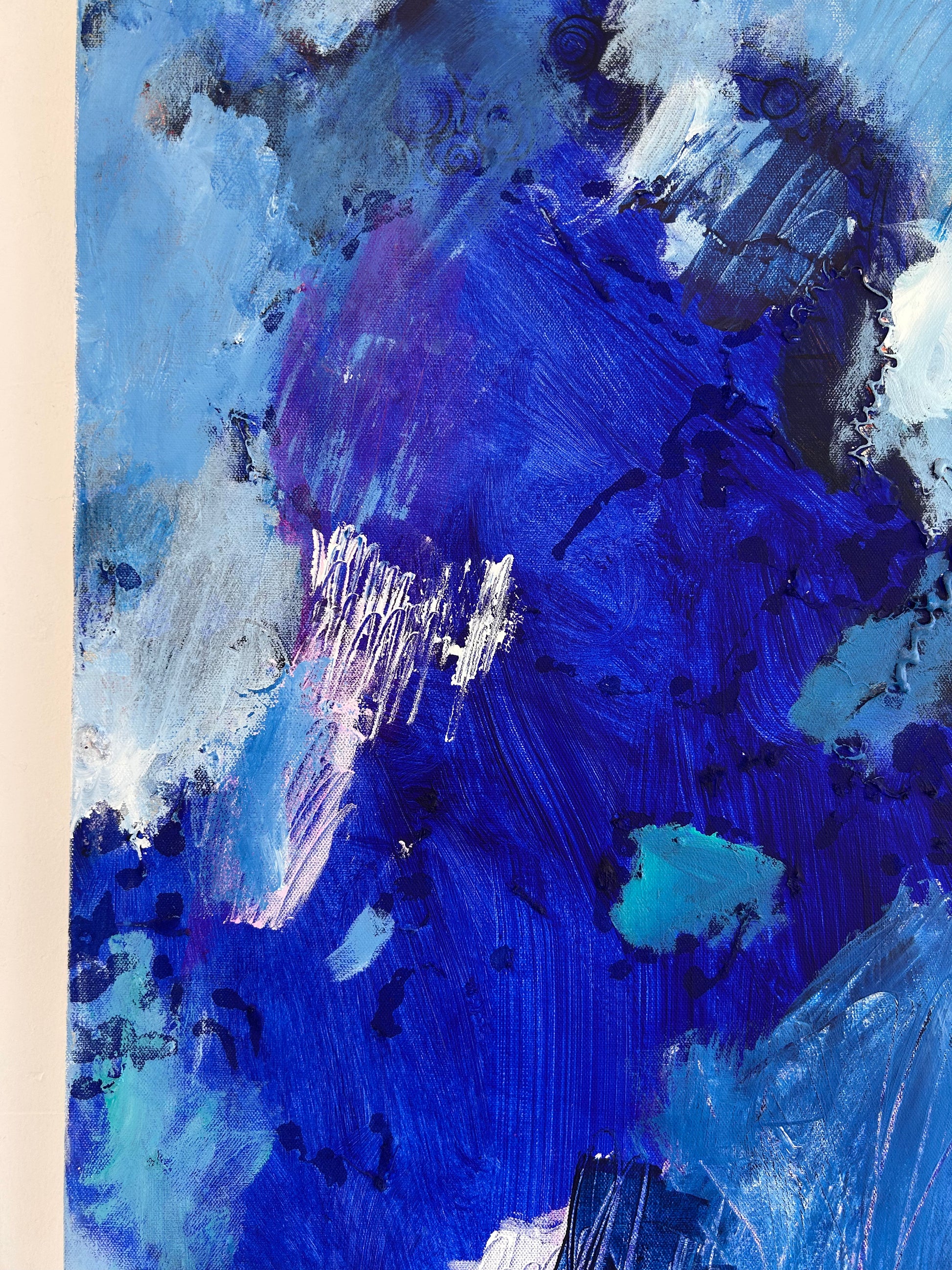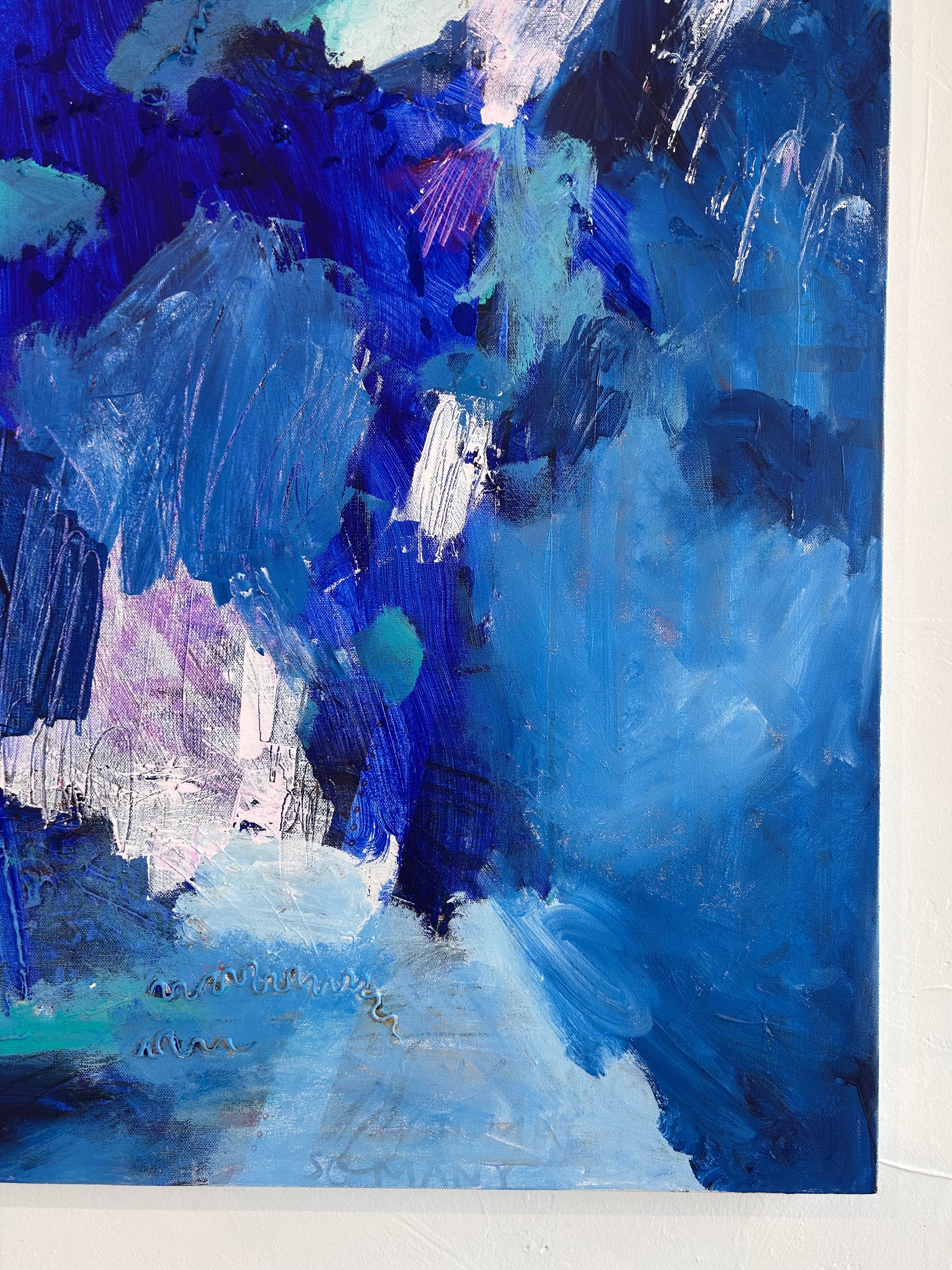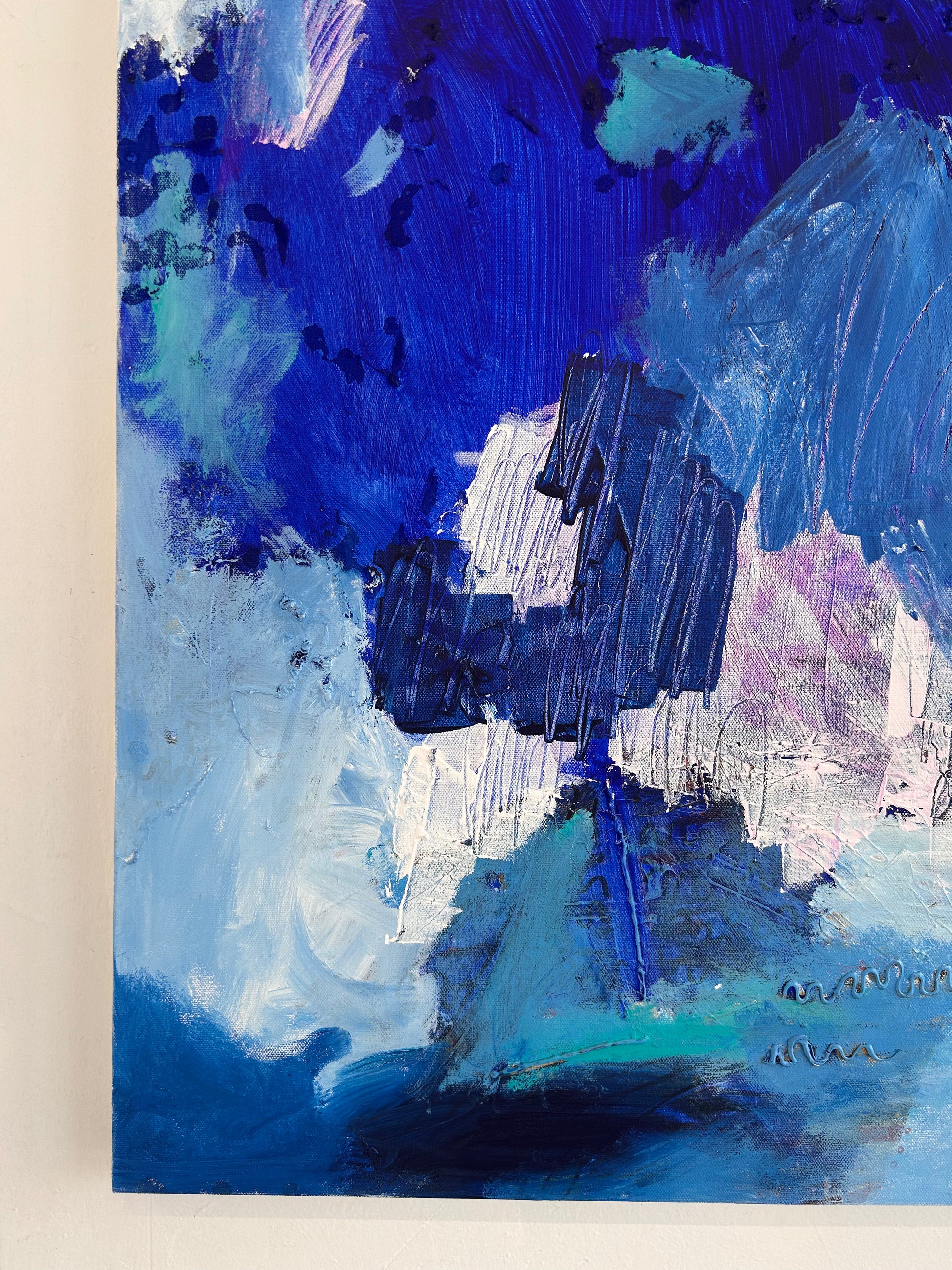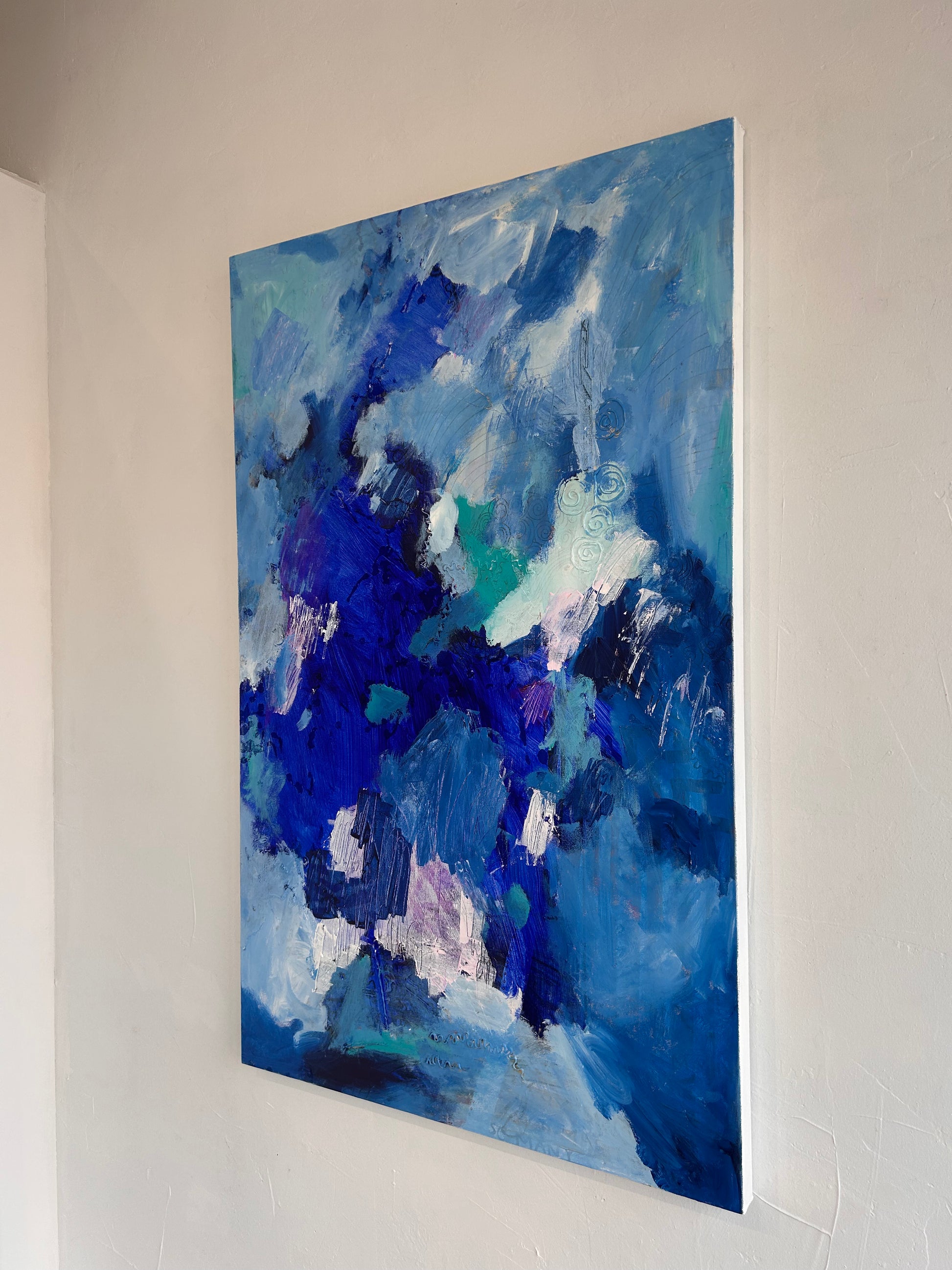 Contemplative Bliss is a 48"x30" mixed media composition by Rachel Townsend that merges diverse materials and techniques to create visual depth and complexity. This substantial work invites prolonged viewing, revealing layered textures and nuanced color relationships that engage the viewer's eye across its expansive surface. The artist's skillful integration of multiple media demonstrates sophisticated compositional control, making this piece a compelling addition to discerning collectors' galleries and thoughtfully curated spaces.