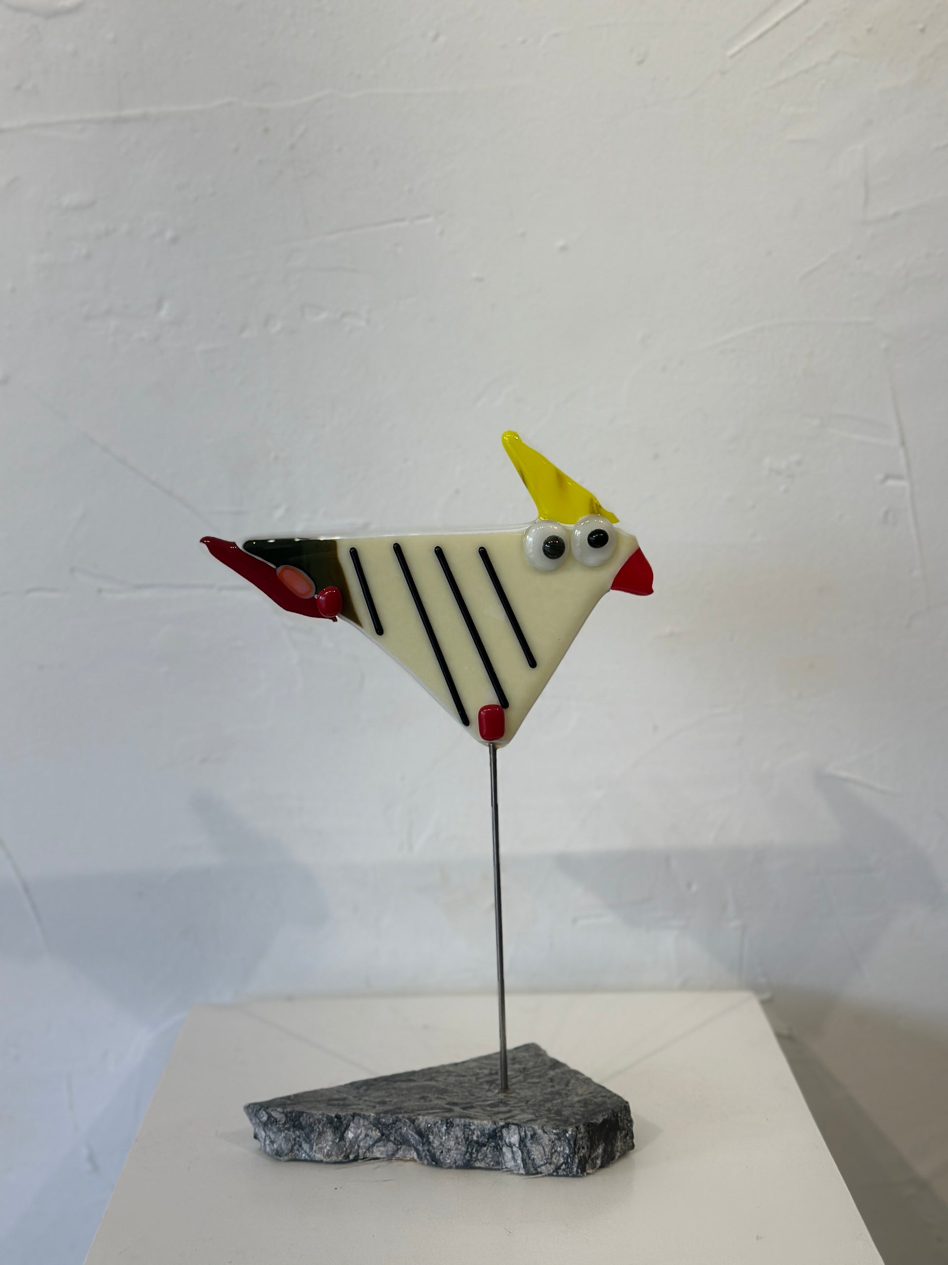 Handcrafted fused glass sculpture by acclaimed artist Kashmira Mistry, featuring a charming flock of chickens rendered in vibrant, assorted colors. Each piece is individually created, making subtle variations in hue and dimension inherent to the artistic process. This gallery-quality work showcases the artist's mastery of glass fusion techniques, combining technical precision with whimsical subject matter. In-store purchase only. A distinctive addition to any art collection or home décor. Crafted from fused glass, steel and granite.