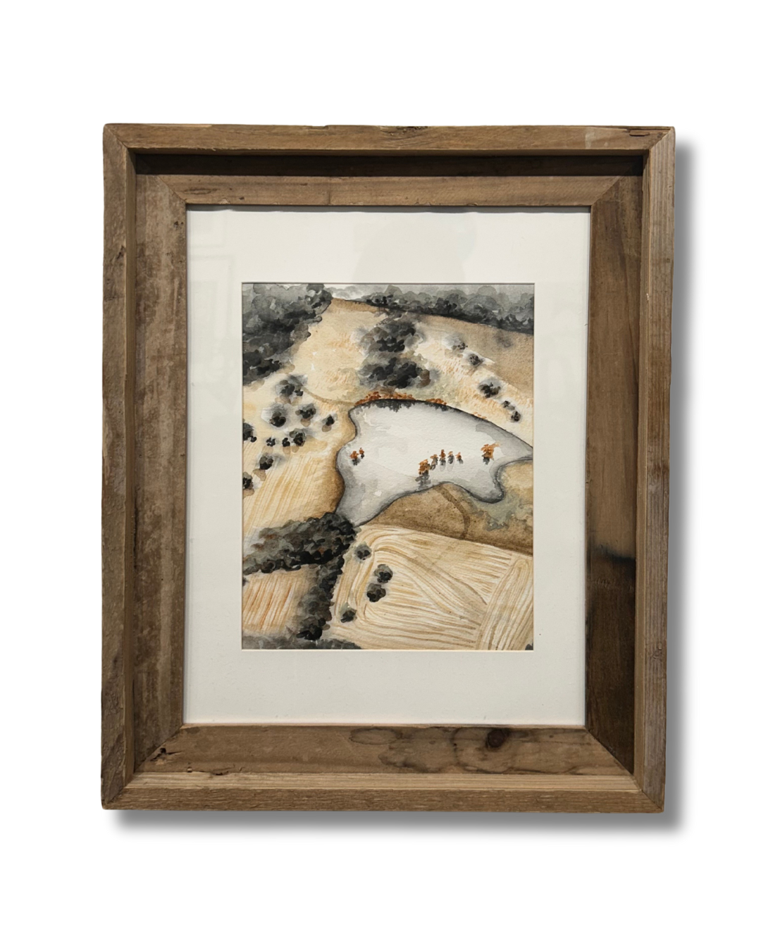 From Above captures a serene aerial perspective of a tranquil lake, rendered in soil and charcoal-based watercolors by artist Fawn Brown. This 9"x12" composition showcases the subtle interplay of natural pigments, creating an earthy, contemplative aesthetic. The painting arrives framed in rustic wood, ready for display. A distinctive piece that celebrates both the landscape and the artist's innovative use of unconventional materials.