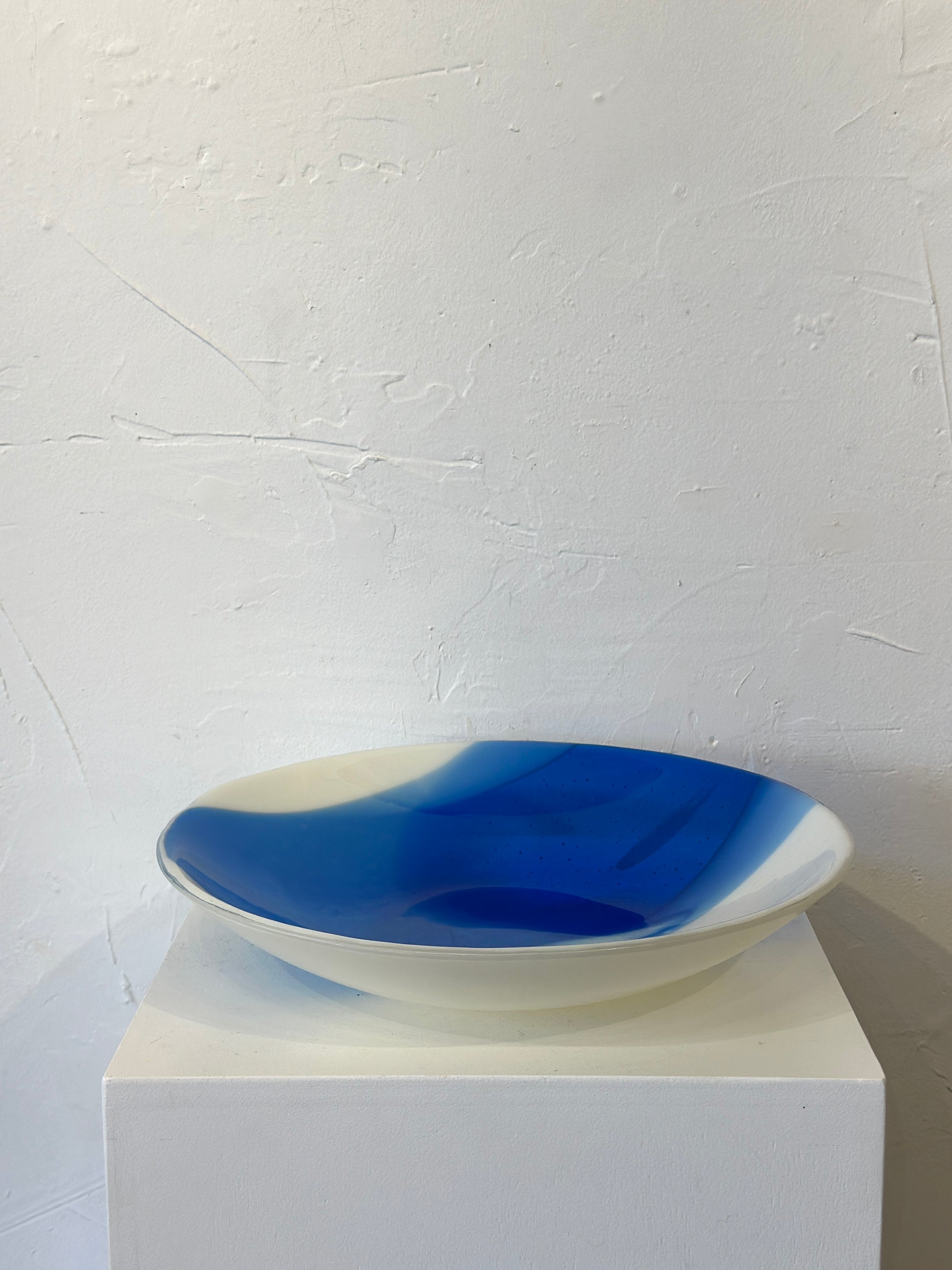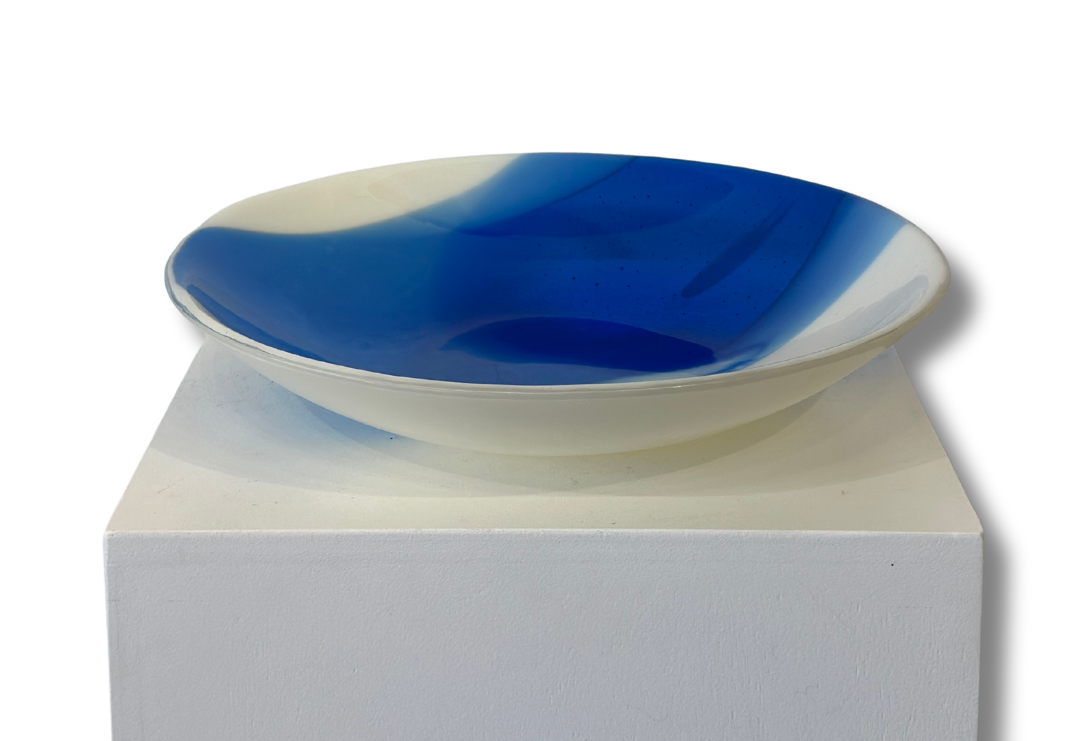 This striking fused glass bowl showcases the masterful artistry of Kashmira Mistry, combining rich cobalt blue with pristine white in a harmonious composition. Each piece is individually crafted through the fusing process, creating unique color variations and depth that catch the light beautifully. The generous size makes it an ideal statement piece for display or functional use. Perfect for collectors who appreciate contemporary glass art and those seeking a sophisticated accent for any interior space. One of a kind piece.