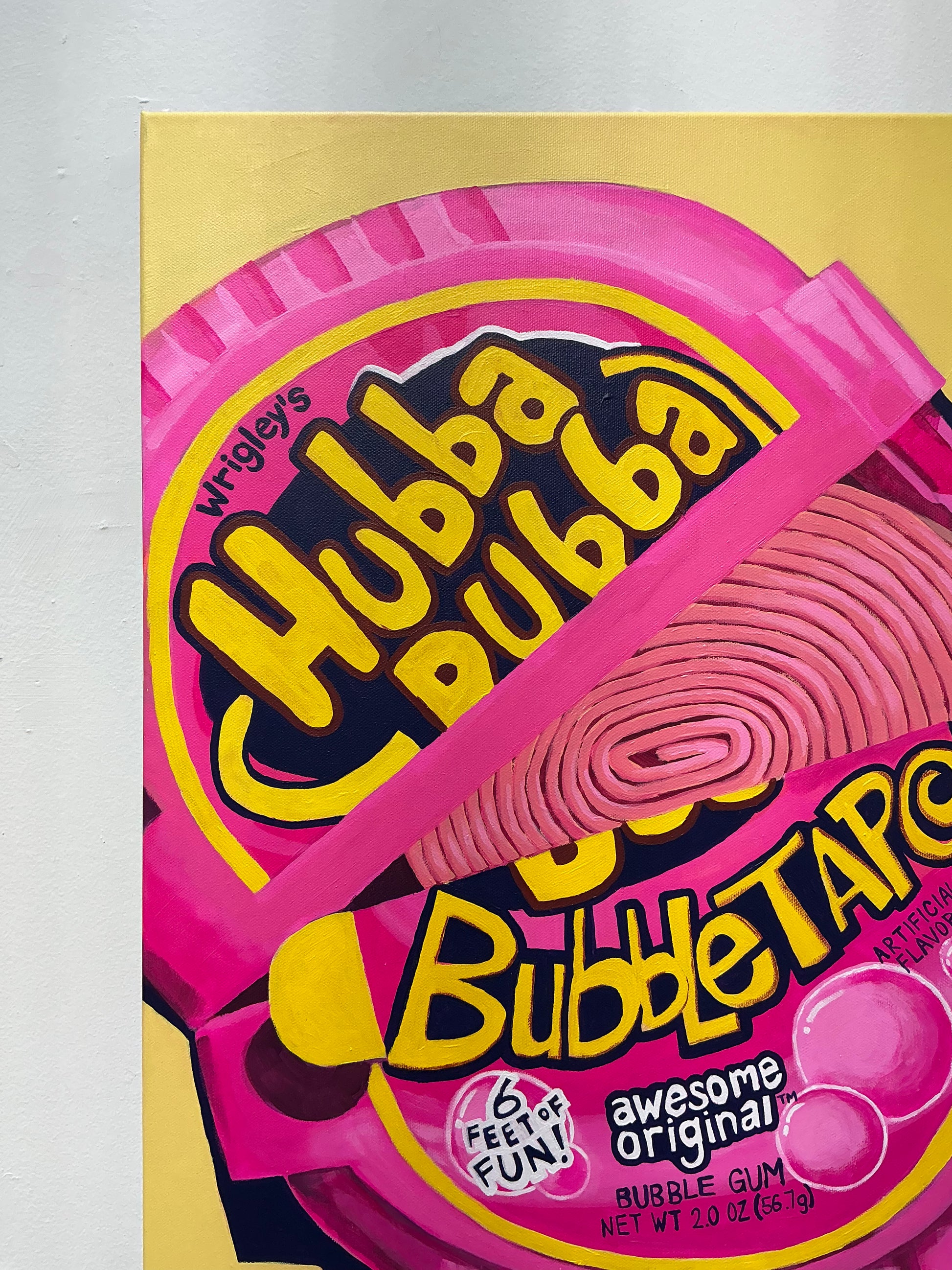 Hubba Bubba Bubble Tape is a nostalgic pop art painting by Lindsay Jow, rendered in acrylic paint on 36”x24” canvas. This original piece tastefully complements sweet treats and contemporary decor. Its vibrant colors enliven the viewer and add a sense of playfulness to any space.