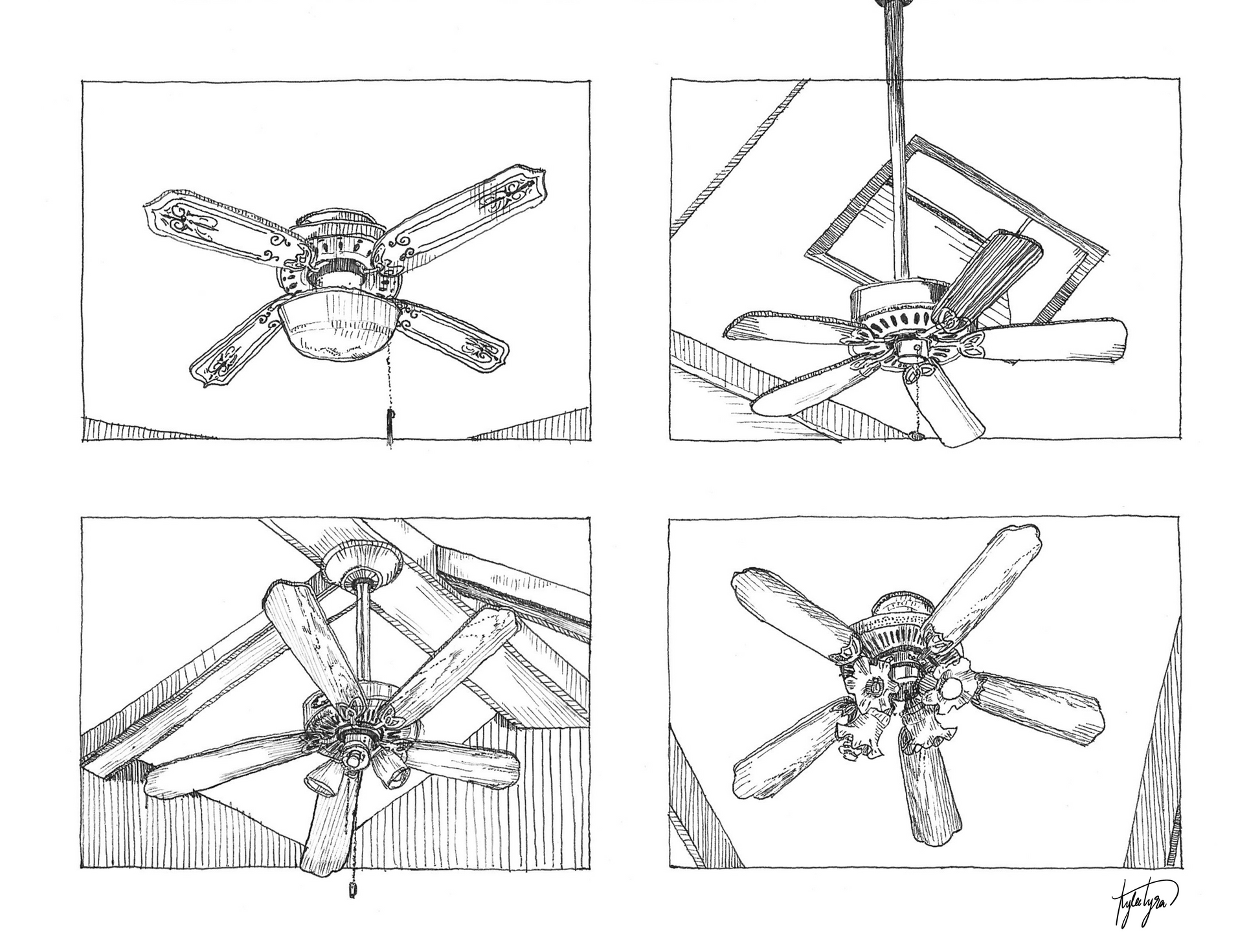 This striking 8"x10" pen and ink drawing captures the architectural character of overhead ceiling fans with meticulous detail and technical precision. Artist Kylee Tyra renders each fixture with careful attention to form and shadow, exploring how these utilitarian objects define interior spaces. The composition showcases multiple fan designs, inviting viewers to appreciate the often-overlooked geometry and craftsmanship of everyday elements. A sophisticated piece for collectors who value observational art and skilled draftsmanship.