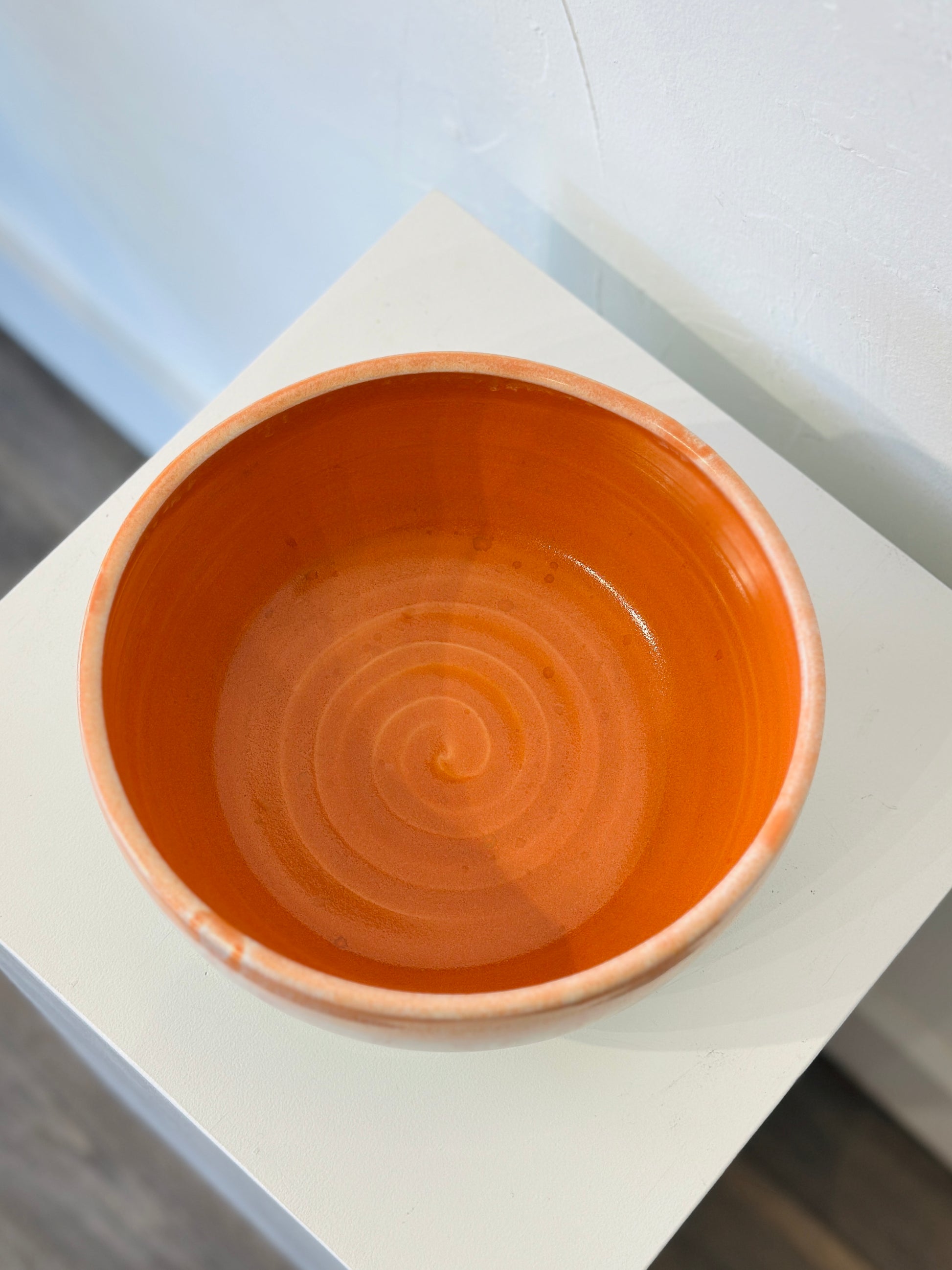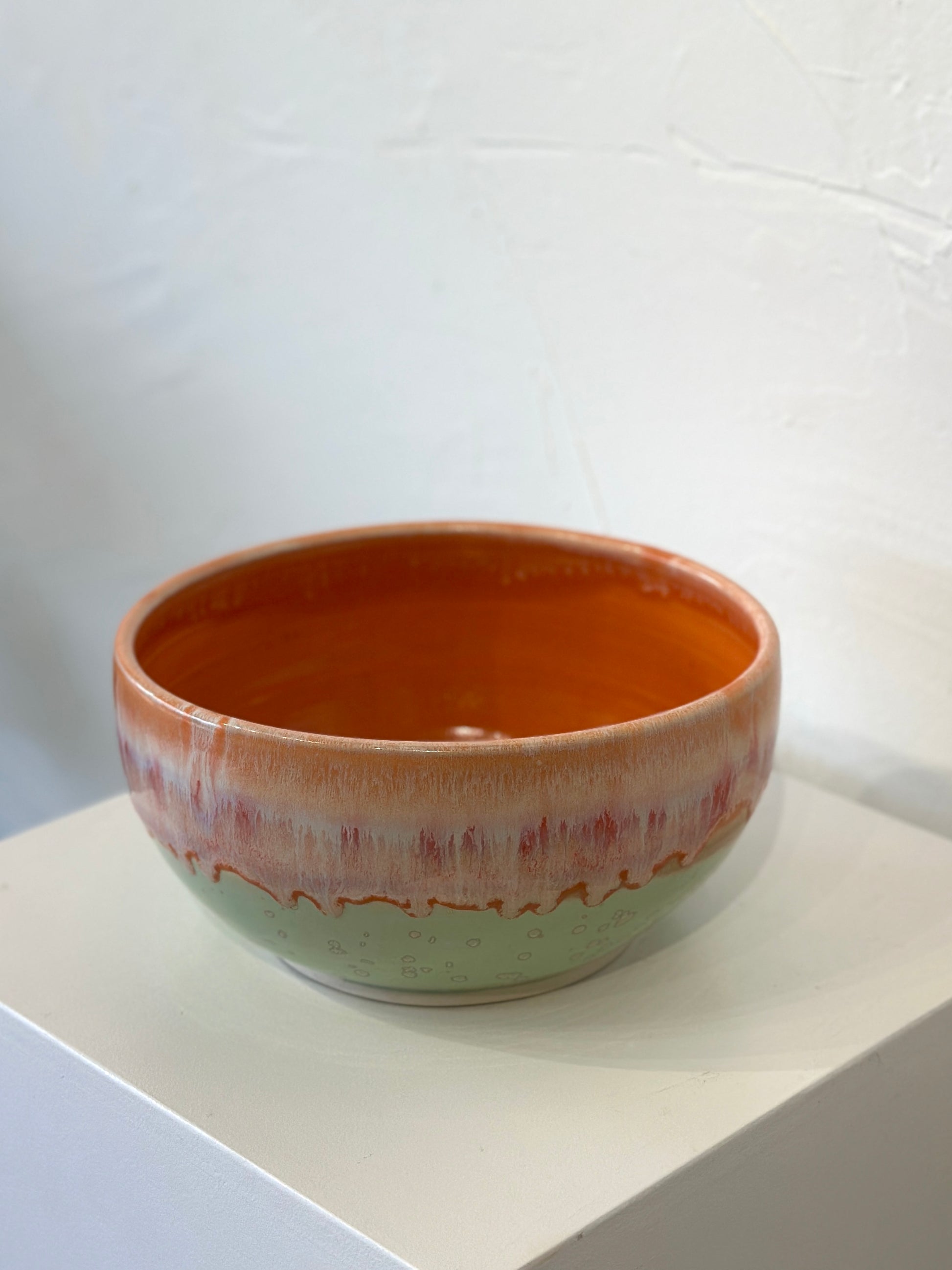 Handcrafted ceramic bowl by Morghan Gray, showcasing a striking tangerine and seafoam color palette created with meticulously mixed glazes. This functional piece combines artistic vision with everyday practicality. Food safe, microwave safe, and dishwasher safe for effortless care. A distinctive addition to any table setting that celebrates artisanal craftsmanship.