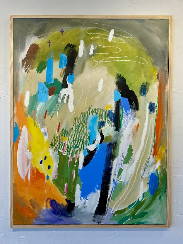 Over the River and Through the Woods is an original mixed media painting on canvas, measuring 48" x 36". This substantial artwork combines various materials and techniques to create visual depth and complexity. The piece is professionally framed in natural pine wood, ready for immediate display. Crafted by RTown, this work exemplifies contemporary mixed media artistry, offering collectors a distinctive statement piece that commands attention in any interior space.