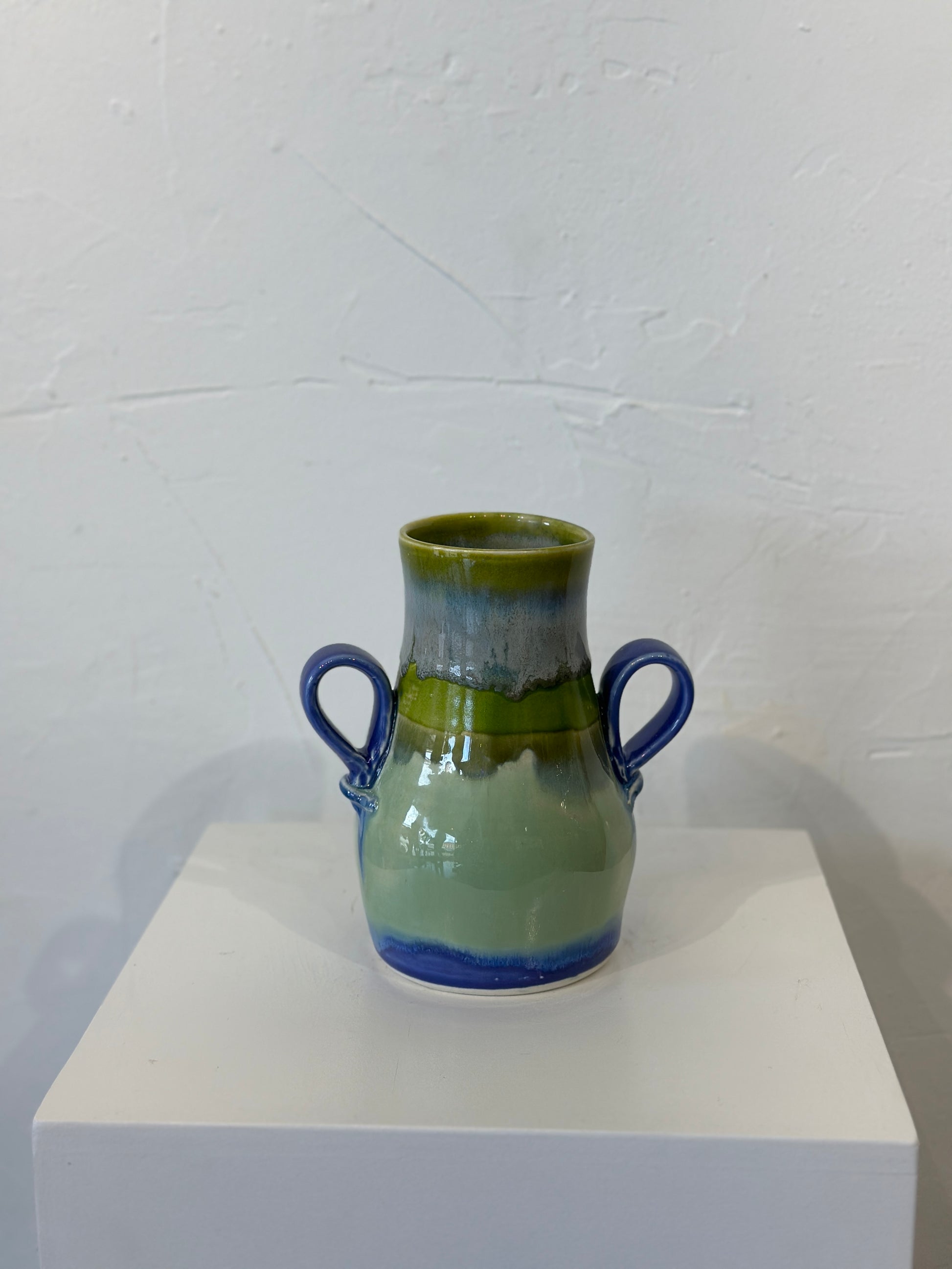 This handcrafted vase by Morghan Gray showcases a sophisticated palette of sage and olive green tones, complemented by striking blue handles. Each piece features meticulously hand-mixed, food-grade glazes that deliver both aesthetic appeal and practical functionality. The durable finish withstands microwave heating and dishwasher cleaning, making it equally suited for everyday use or display. A versatile addition to contemporary or eclectic interiors.