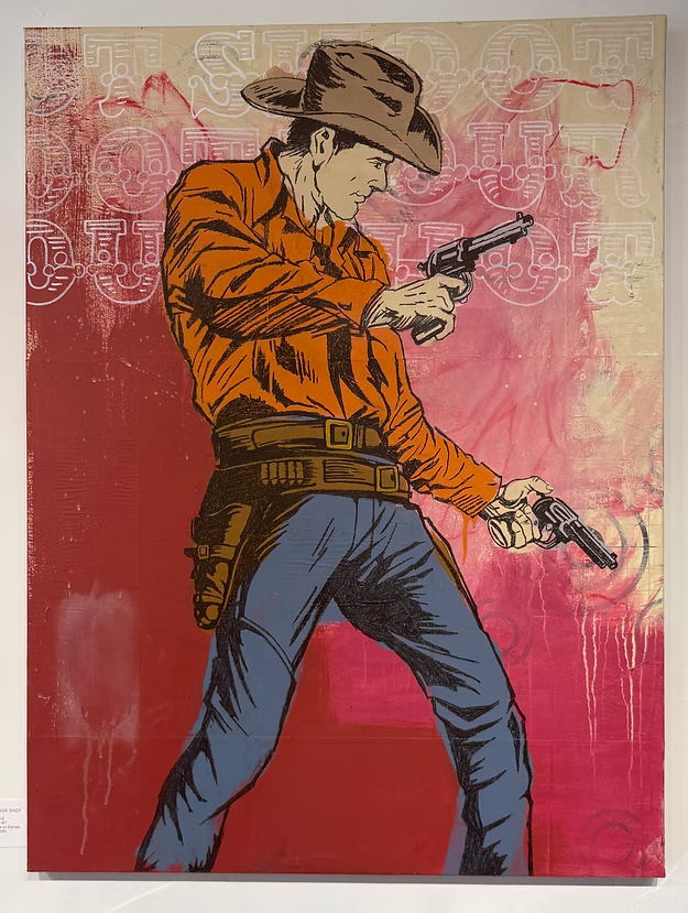 Shoot Your Shot is a striking mixed media composition on canvas that commands attention at 30" x 40". This substantial artwork combines diverse materials and techniques to create visual depth and complexity, inviting viewers to engage with its layered surfaces and dynamic composition. The mixed media approach allows the artist to explore multiple textures and perspectives within a single piece, resulting in a work that rewards close examination. Ideal for collectors seeking contemporary art with conceptual richness and technical sophistication.