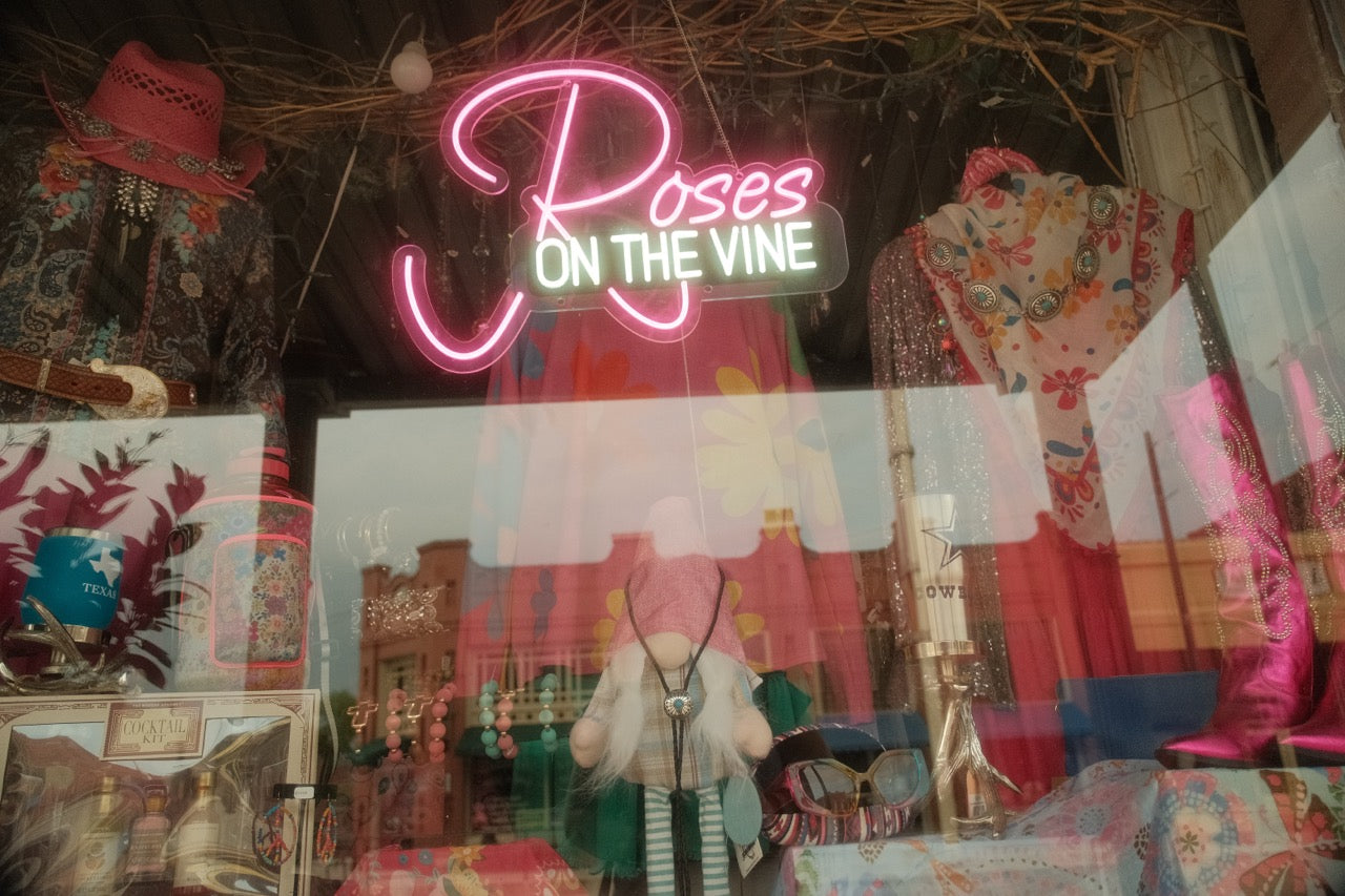 Icons of Texas documents the vibrant floral display at Roses on the Vine, a beloved Grapevine landmark. This photograph captures the storefront's signature window arrangement, showcasing the artistry and botanical expertise that defines the shop's reputation. The image reveals the interplay of natural light with carefully curated blooms, highlighting color, form, and the meticulous attention to detail that makes this local institution a visual destination. An ideal piece for those who appreciate both horticultural beauty and the character of Grapevine's distinctive retail heritage.