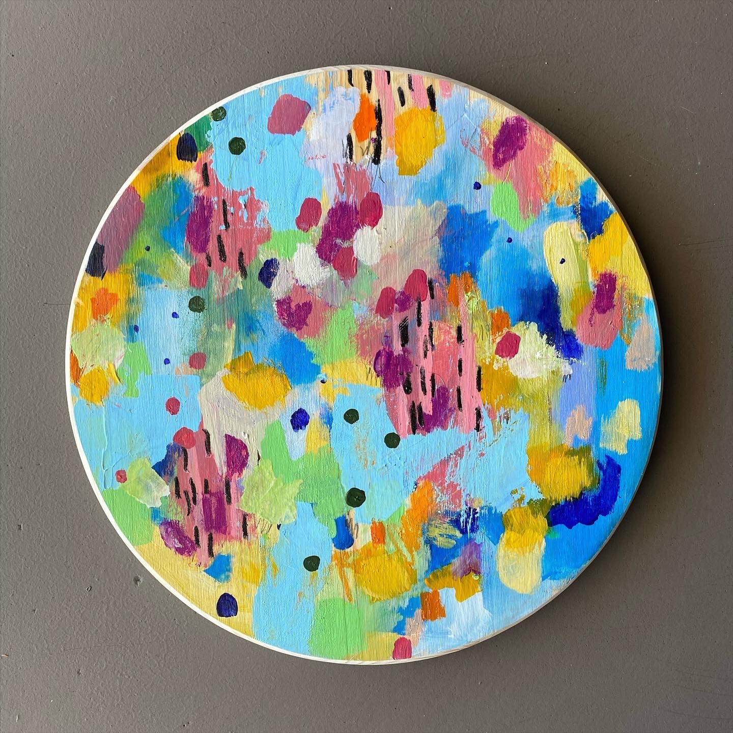 When I Wake is an original painting by Rachel Townsend, featuring a dynamic mixed-media composition on an 18-inch diameter wood panel. The artist combines acrylic, oil pastel, and wood carving techniques, finished with a protective clear glaze that enhances depth and luminosity. The circular format creates an intimate viewing experience, while the D-ring mounting system on the back ensures straightforward installation. A distinctive statement piece for collectors seeking contemporary artwork with tactile, layered craftsmanship.