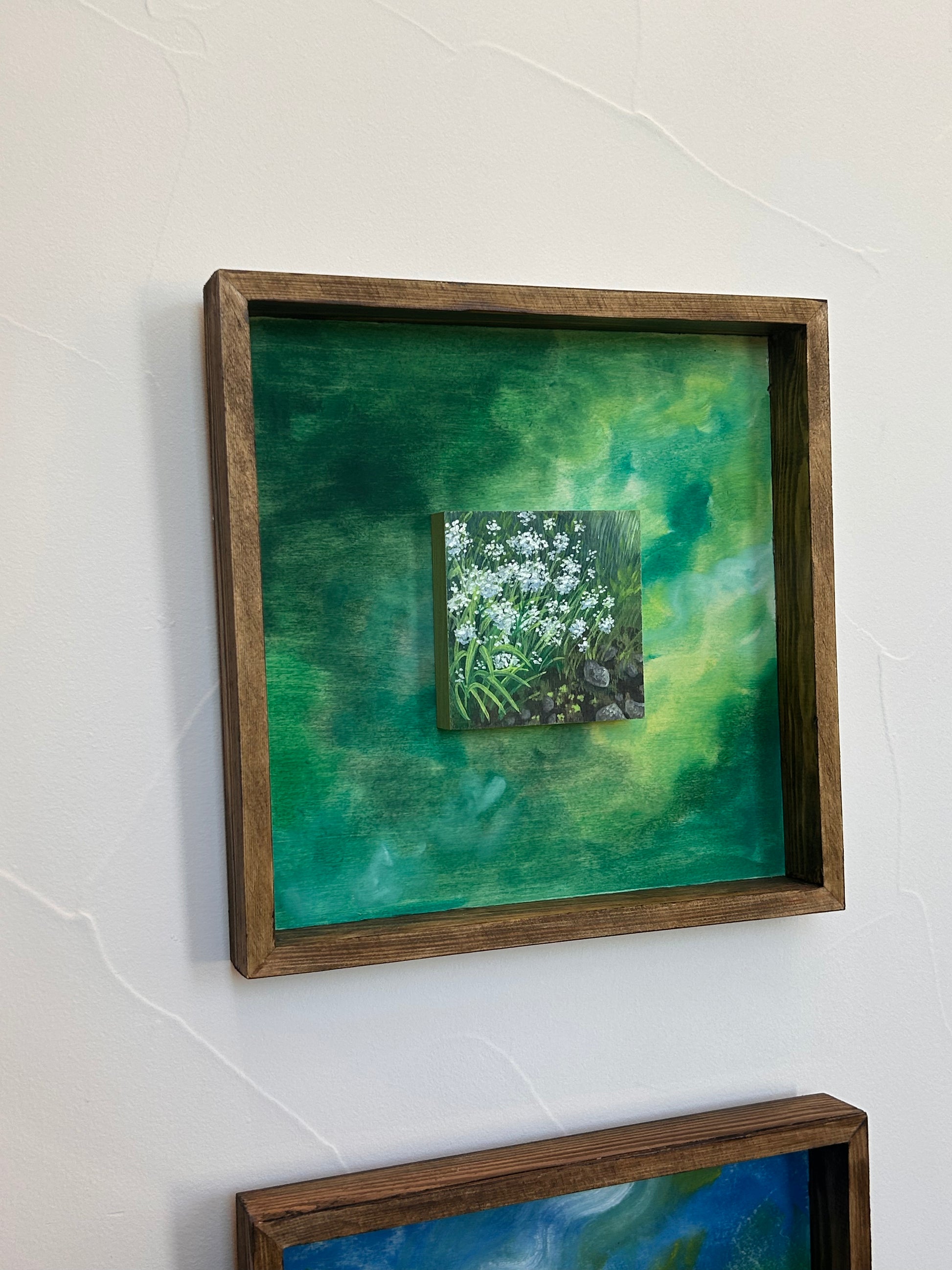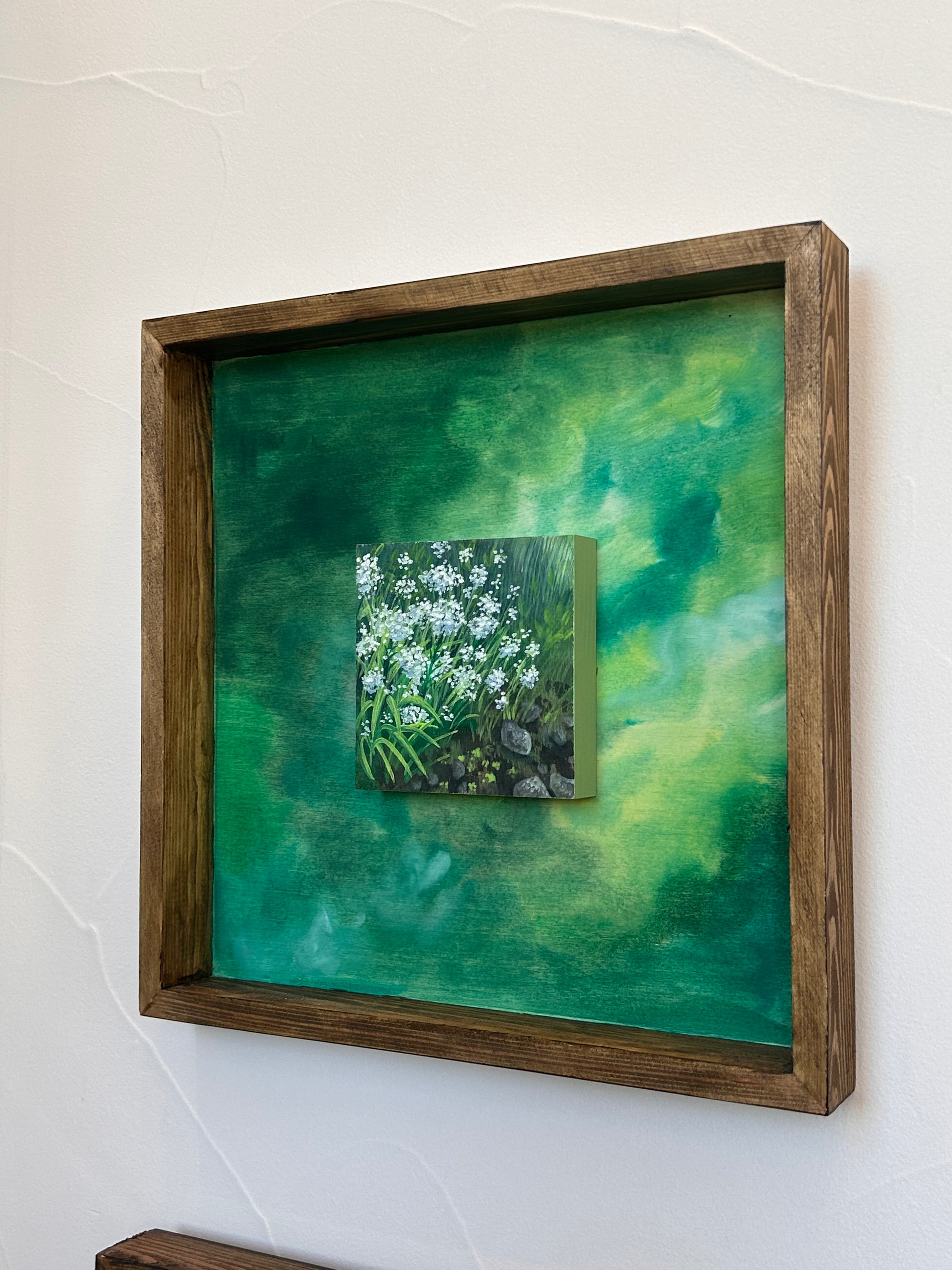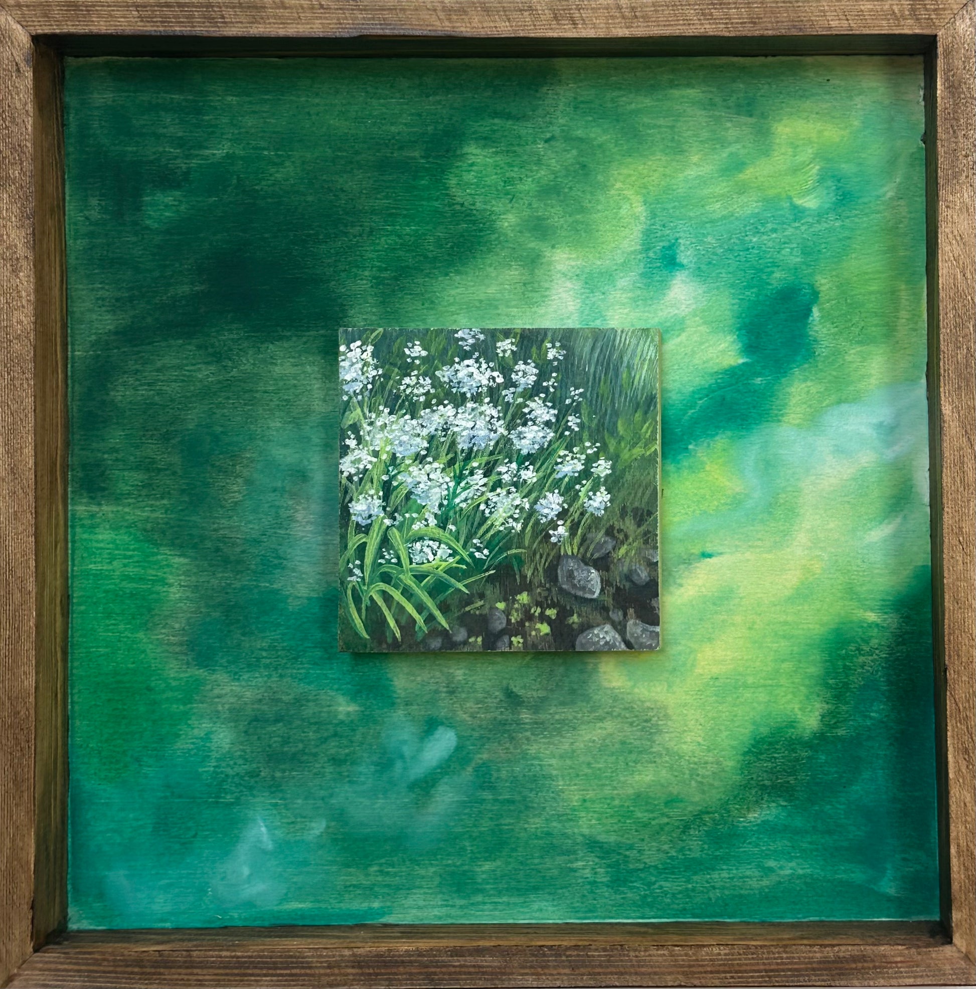 Wild Yarrow showcases delicate botanical forms rendered in gouache on wood panel. This 12"x12" composition captures the intricate branching structure and clustered flower heads characteristic of yarrow plants, executed with the luminous quality gouache provides. The artist's expert handling of the medium creates subtle color variations and translucent layers that bring depth to the natural subject. A refined piece for collectors who appreciate detailed botanical art and traditional painting techniques on unconventional surfaces.