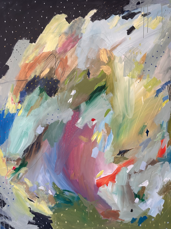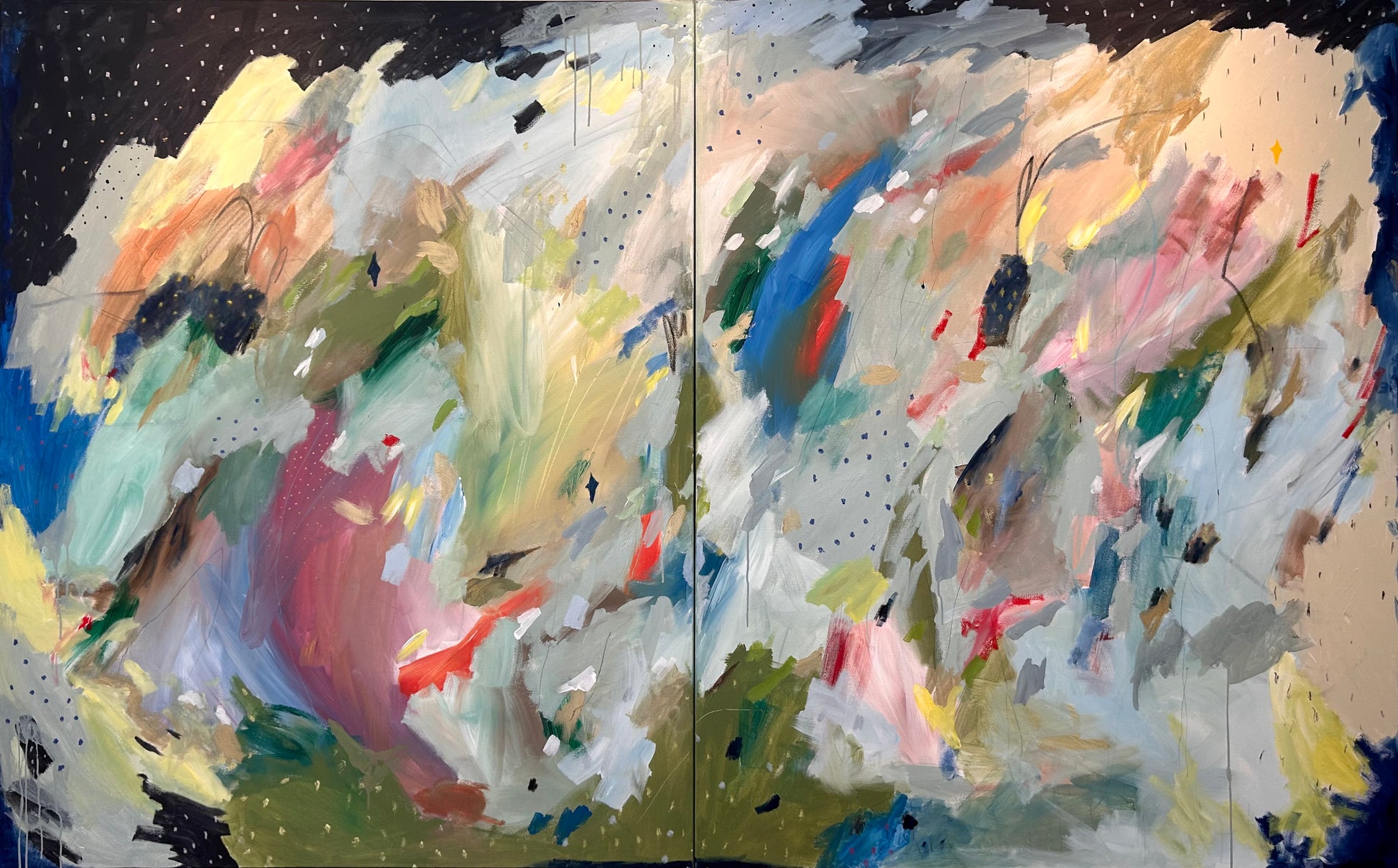 Written in the Stars is a striking mixed media diptych by Rachel Townsend, commanding attention at 60" x 90". This expansive two-panel composition merges diverse materials and techniques to create a cohesive visual narrative. The monumental scale and sophisticated layering of mediums demonstrate Townsend's mastery of contemporary mixed media practice, making this work a significant statement piece for collectors seeking depth and artistic complexity. Ideal for gallery spaces or substantial residential interiors.